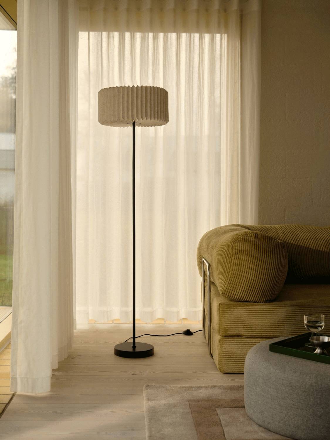 - Plisseret tekstilskærm for blød og diffus lysfordeling