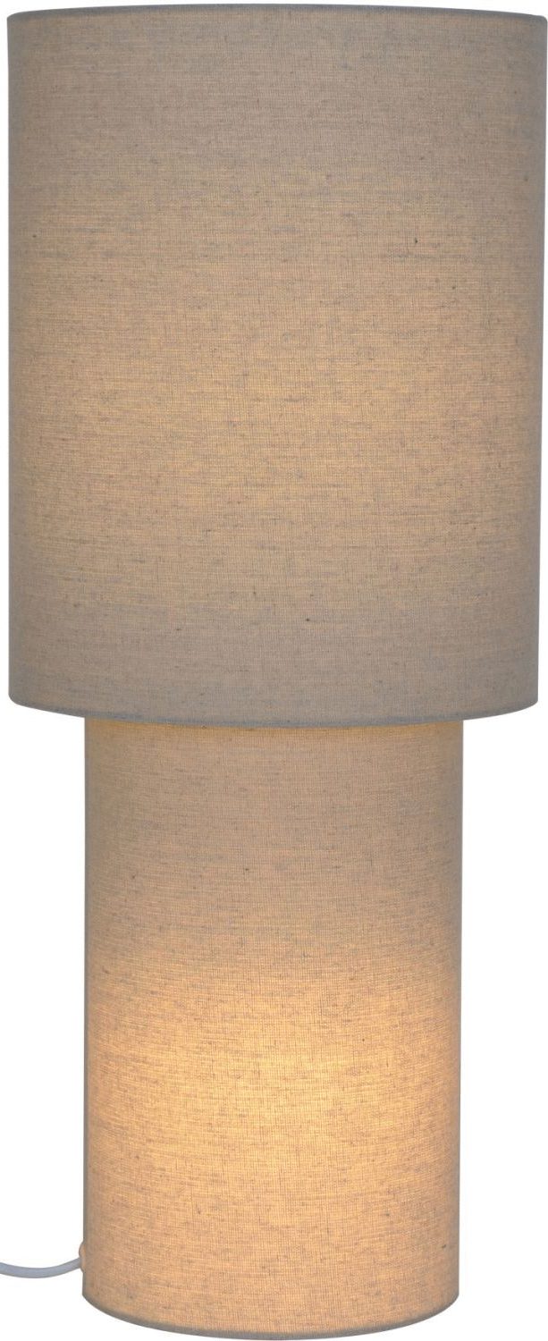 - Cylinderformet design i beige med linnedskærm i tekstil