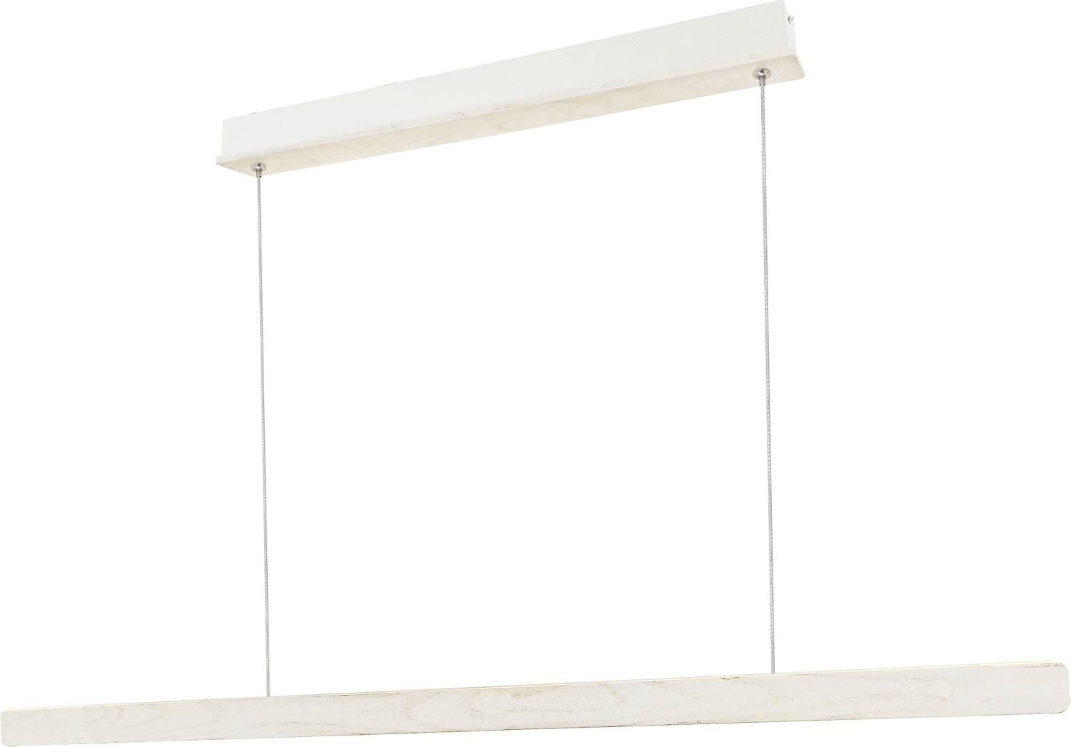 Pendlen er fremstillet i træ med en hvid finish, der giver en let og luftig atmosfære. Den slanke profil på kun 5 cm i bredden og 4,5 cm i højden sikrer, at lampen ikke virker dominerende, selvom den dækker et større område. Dette gør den velegnet til både store og mindre rum, hvor den tilfører karakter uden at fylde visuelt.