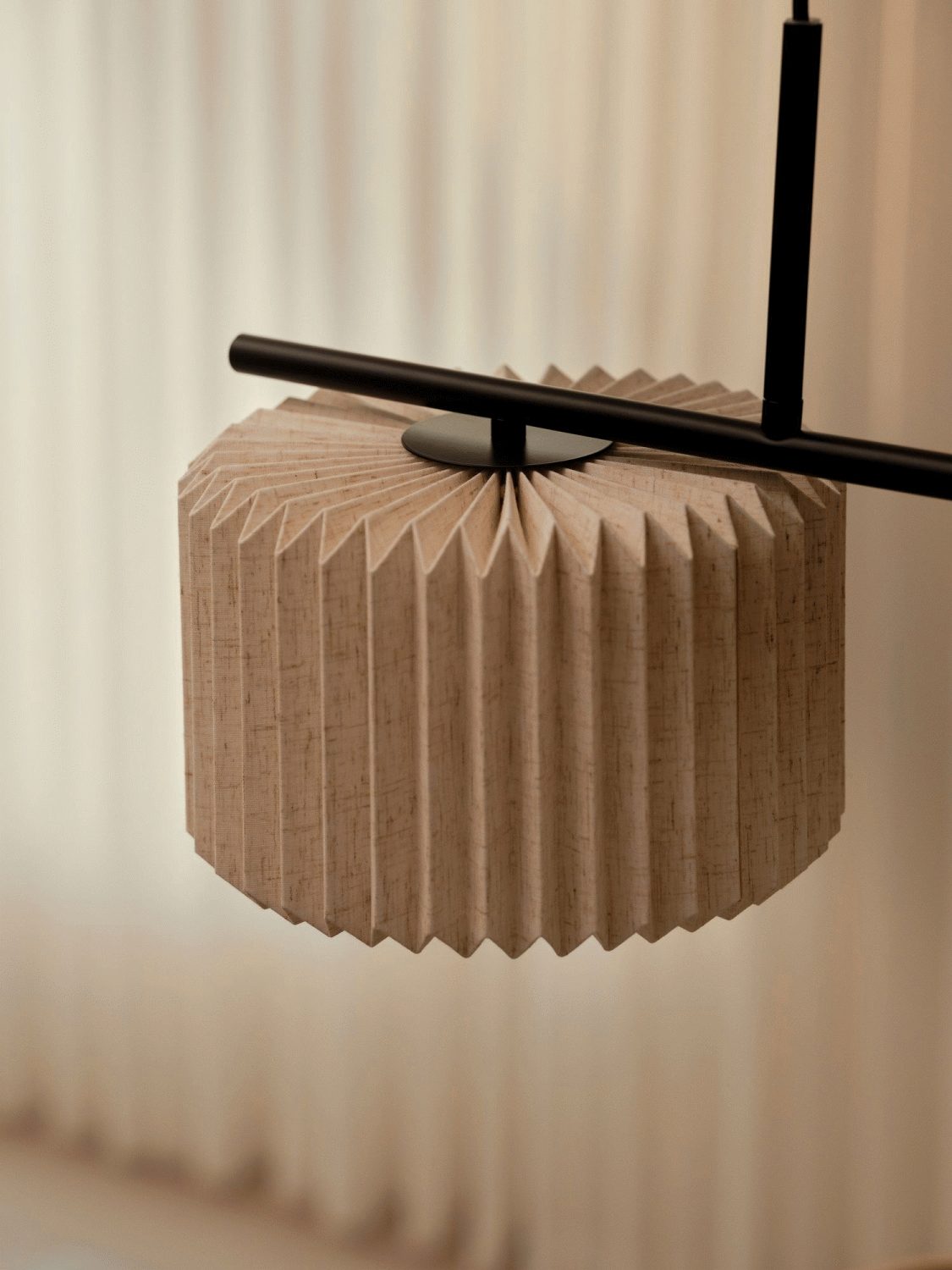 Den sorte tekstilskærm er omhyggeligt plisseret, hvilket giver pendlen et dekorativt og blødt udtryk. Når lyset tændes, filtreres det gennem tekstilet og skaber en varm belysning, der fremhæver rummets arkitektur uden at virke skarp eller dominerende. Kombinationen af tekstil og metal giver pendlen et tidløst design, der nemt finder sin plads i både klassiske og moderne indretninger.