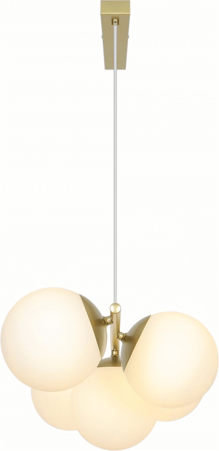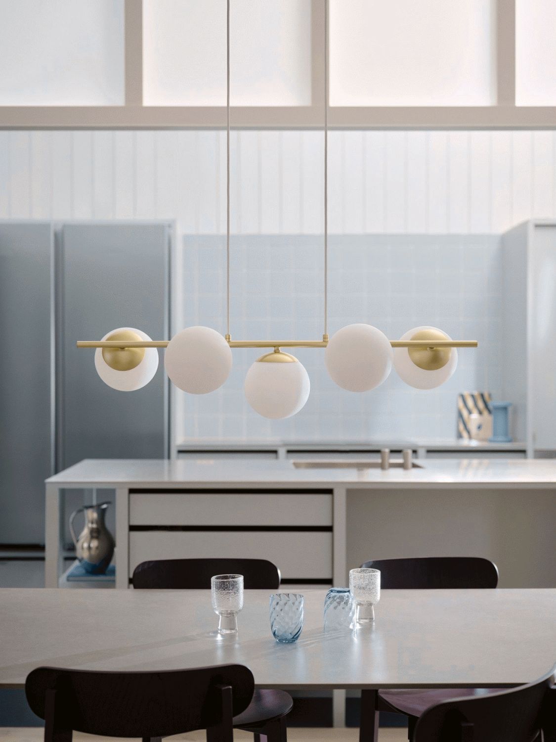 Lampens design bygger på en filosofi om, at enkelhed kan være udtryksfuldt. Det slanke metalophæng i varm messing danner en blød kontrast til de runde glasskærme, der spreder lyset på en behagelig måde gennem rummet. Opalglasset sikrer en jævn lysfordeling uden hårde skygger, hvilket gør pendlen ideel til placeringer over spisebordet, hvor den skaber en indbydende stemning til måltider og samvær.