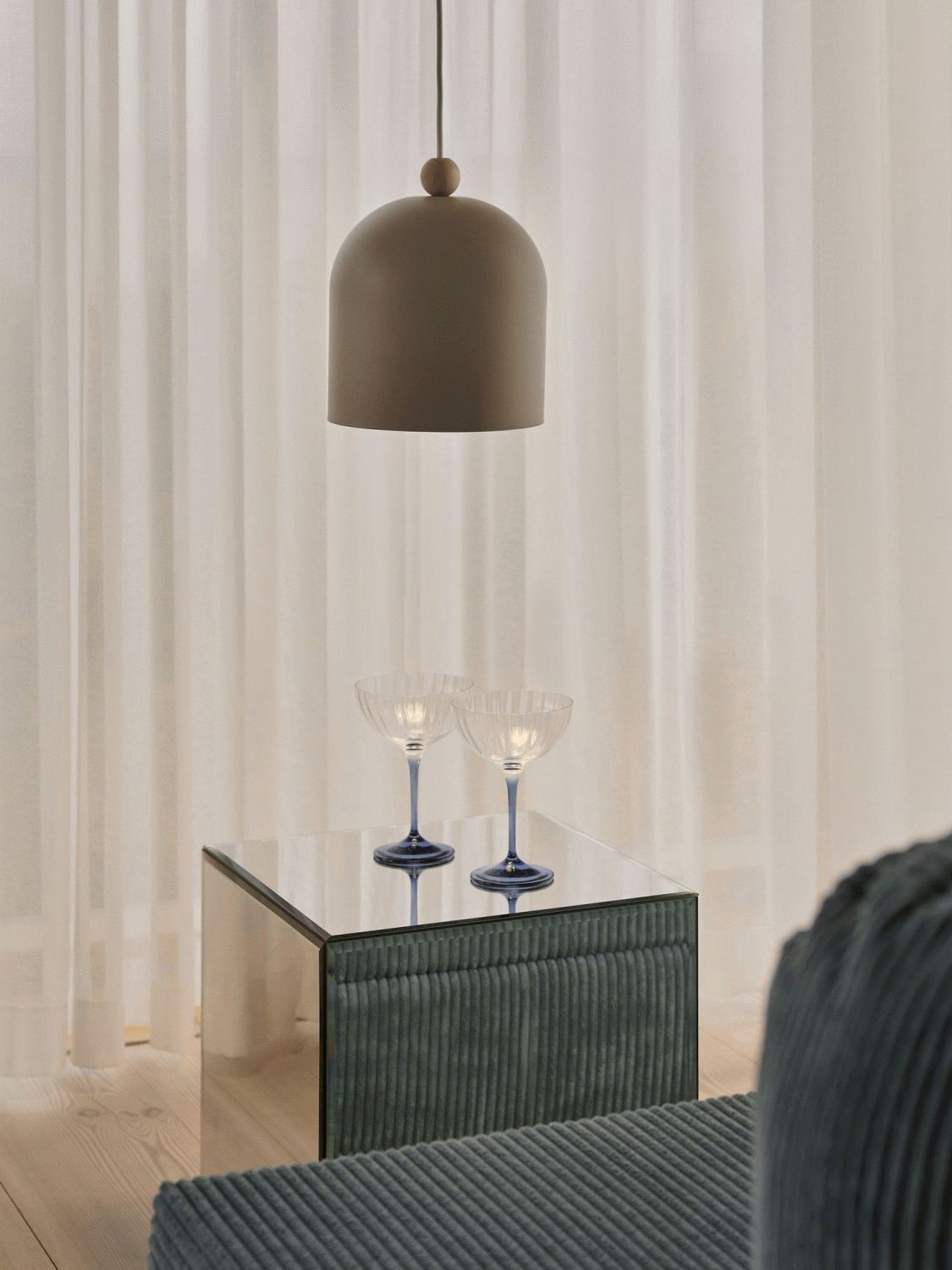 Den strømlinede form gør Gaston til et alsidigt valg, der nemt integreres i forskellige indretningsstile. Skærmens afdæmpede farve skaber en blød kontrast til hvide vægge og lyse møbler, mens den samtidig tilfører varme til rummet. Den lille trædetalje på toppen af pendlen er et gennemtænkt designelement, der bryder metallens kølige udtryk og tilføjer en naturlig dimension til den samlede æstetik.