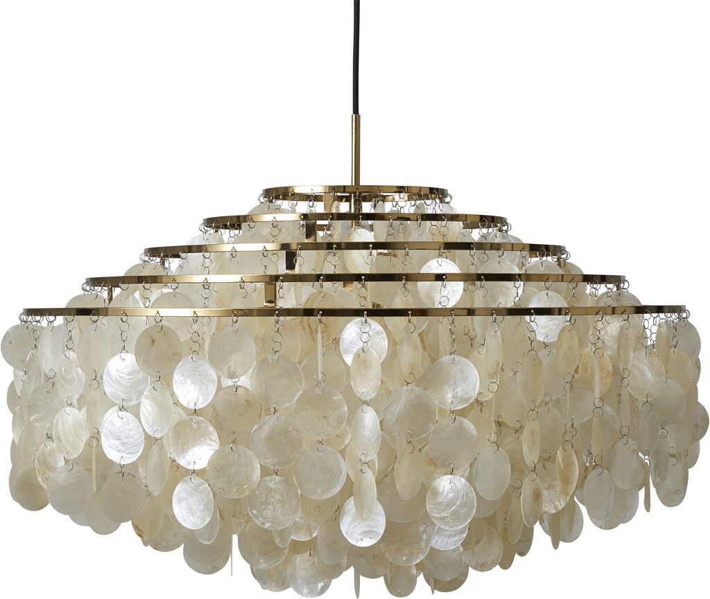 FUN 11DM er en pendel med med stel i messing finish og naturlige muslingeskaller.Mange betragter FUN serien som en af Verner Pantons største mesterværker indenfor belysningsdesign. FUN lamperne afgiver et blødt og naturligt lys, og de lette og sarte muslingeskaller bidrager desuden med bevægelse og lyd, og skaber et helt specielt samspil med omgivelserne.