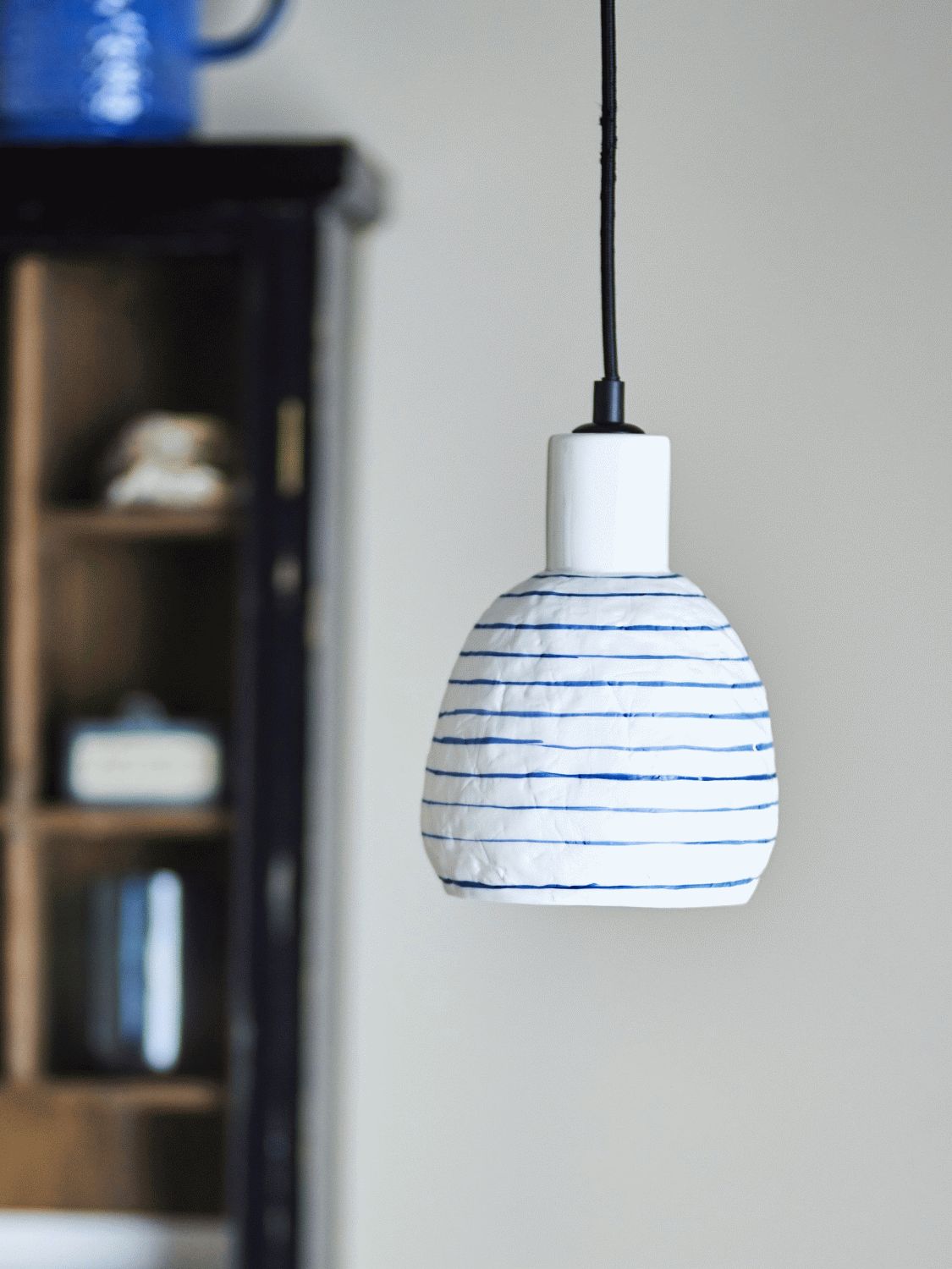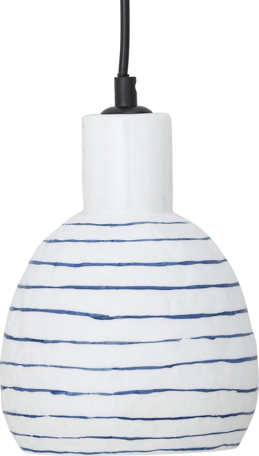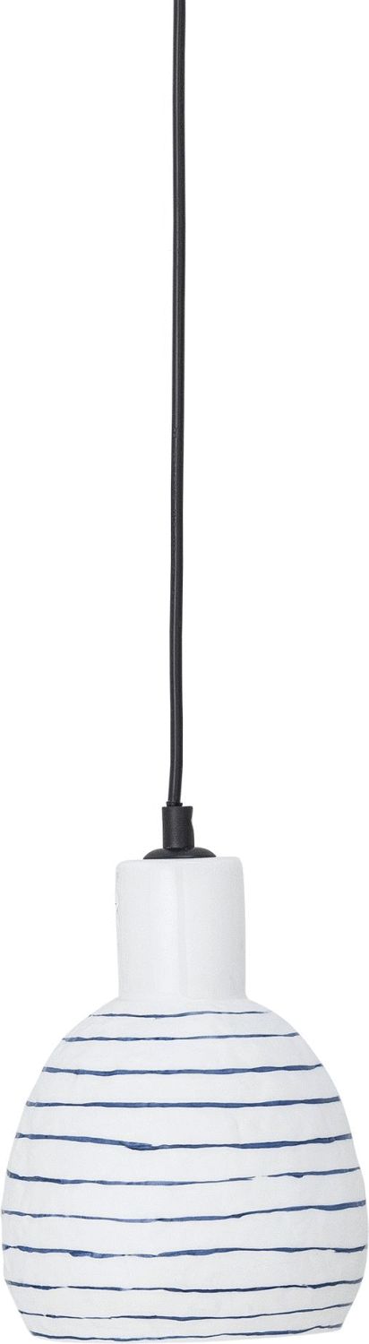 Elga Pendlen fra Creative Collection er en håndlavet pendel i stentøj, der bringer karakter og personlighed ind i ethvert rum. Med sin blødt tilspidsede form og håndmalede overflade fremstår denne pendel som et smukt eksempel på nordisk designtradition, hvor funktionalitet møder kunstnerisk udtryk. Den hvide grundfarve accentueres elegant af dybblå, vandrette linjer, der skaber et visuelt interessant mønster og tilføjer dybde til designet.Stentøjets naturlige egenskaber giver lampen en robust og holdbar konstruktion, mens den håndmalede finish sikrer, at hver enkelt pendel er unik. Små variationer i både mønster og farveintensitet er en naturlig del af produktionsprocessen og understreger det håndværksmæssige præg. Dette gør Elga Pendlen til mere end blot en lyskilde – den bliver et kunstværk i sig selv, der tilføjer personlighed til din indretning.