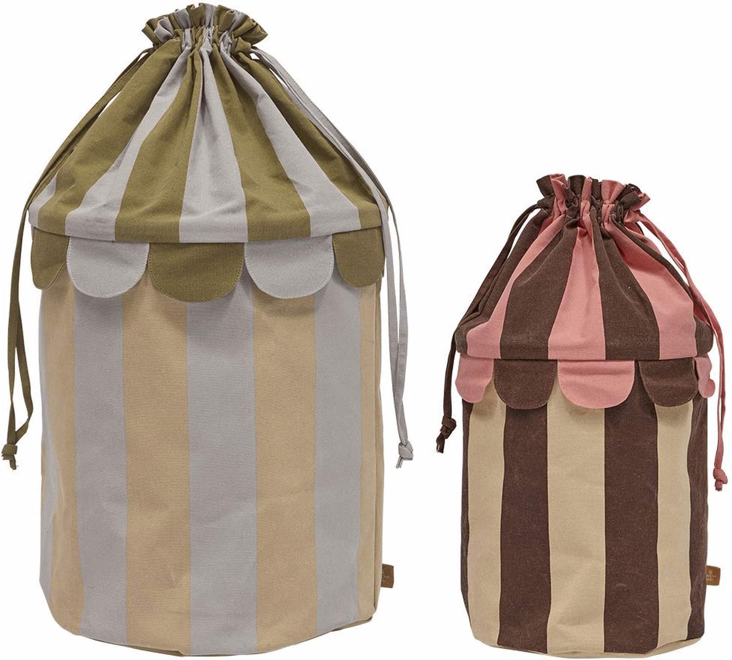 Inspireret af klassiske cirkustelte skaber disse kurve en eventyrlig stemning, mens de samtidig holder styr på legetøj, tøj og andre børneting. Det smukke farvespil i rose og lilla nuancer passer perfekt ind i moderne børneindretning og tilfører et varmt, indbydende præg til rummet.