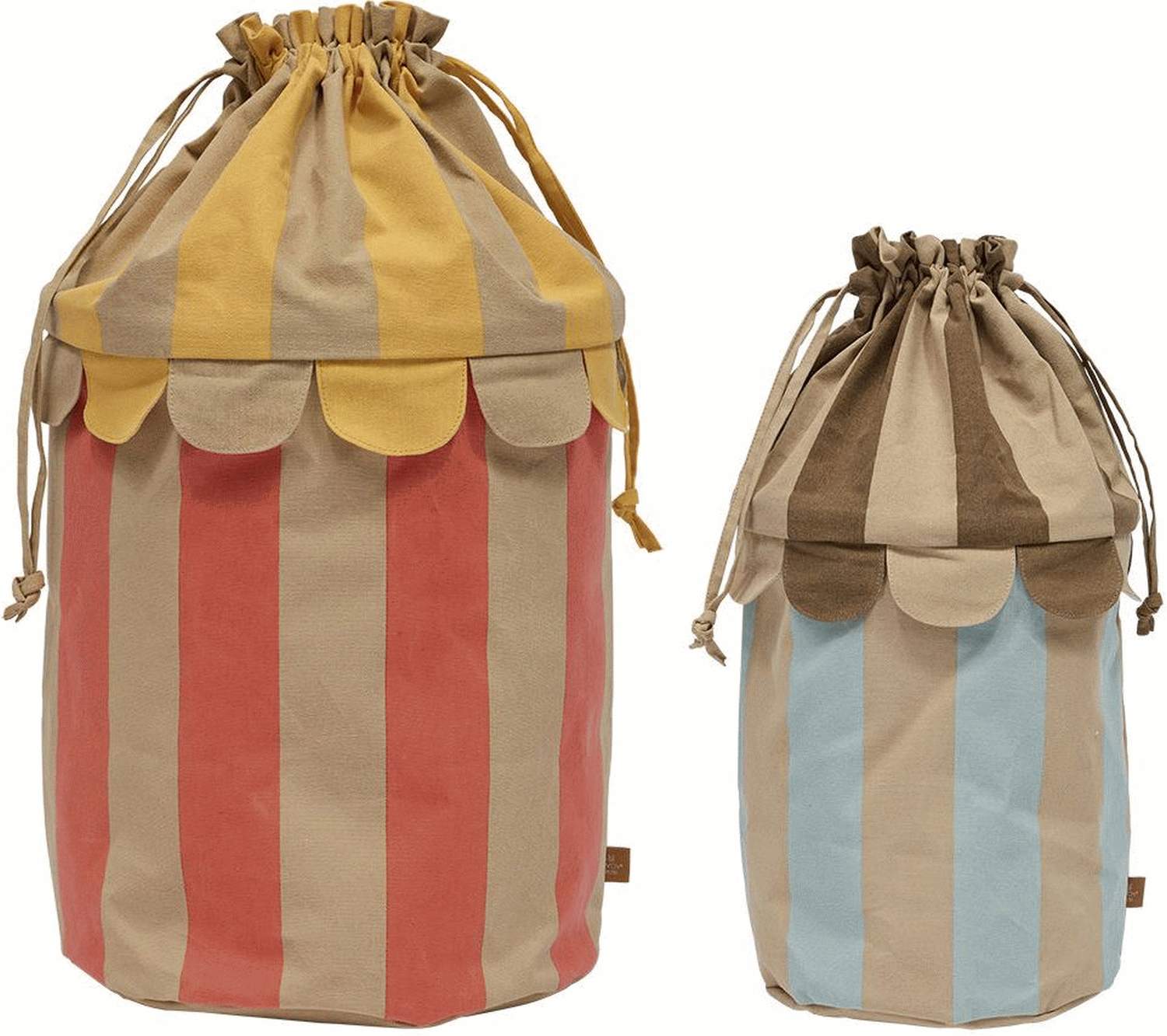 Kurvenes lette konstruktion betyder, at de nemt kan flyttes rundt efter behov - fra legeområdet til sovekammeret eller hvor der ellers er brug for ekstra opbevaring. Det farverige design med de klassiske cirkustelt-nuancer skaber en indbydende atmosfære, der inspirerer til kreativ leg og samtidig holder styr på legetøj, tøj og andre hverdagsting.