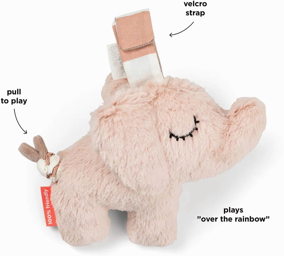 Done by Deer Elphee Musikuro i pudderfarvet design er en charmerende ledsager, der hjælper de mindste med at falde til ro. Med sin bløde tekstur og søde elefantform bliver denne musikuro hurtigt en fast del af den daglige rutine ved sengetid.Musikuroen spiller en blid vuggevise, der skaber en rolig atmosfære i børneværelset. Den behagelige melodi hjælper med at signalere, at det er tid til hvile, og giver barnet en tryg og genkenlig lyd at falde i søvn til. Det simple træk i snoren aktiverer musikken, så selv de mindste hænder med tiden kan lære at bruge den selv.