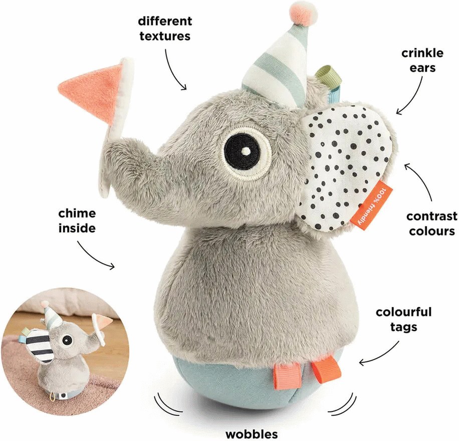 Legetøjet er udstyret med en klokke, der reagerer på bevægelse og skaber en blid lyd, som vækker barnets nysgerrighed og opmuntrer til aktiv leg. Den vippende funktion gør Elphee til en ideel ledsager under maveligtid, hvor de små kan udforske og interagere med legetøjet på egen hånd. Når barnet rækker ud efter legetøjet, trænes koordinationen og den finmotoriske udvikling på en naturlig og legende måde.