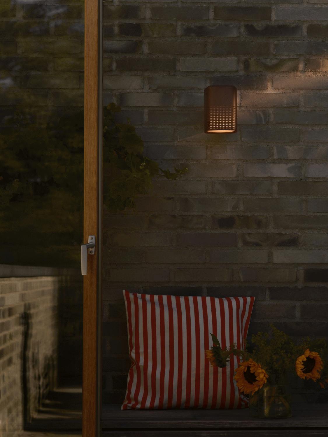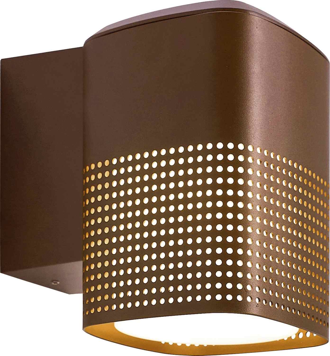 Lampen er fremstillet i aluminium og præsenteres i den flotte farve Seaside Metallisk Brun, som tilfører varme og karakter til facaden. Den gennemtænkte konstruktion med de perforerede detaljer sikrer, at lyset spredes på en dekorativ måde, samtidig med at lampens design i sig selv fungerer som et skulpturelt element på væggen.
