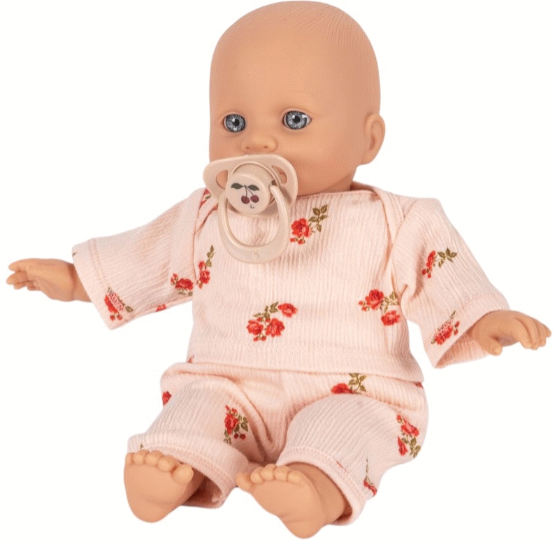 Elisa imponerer med sine realistiske øjne, der har en naturlig dybde og udstråler varme. Hendes bløde krop og todelte bomuldstøj gør hende behagelig at kramme og lege med, mens det medfølgende sut tilføjer en autentisk detalje, der kan berolige både dukke og barn. Det gennemtænkte design kombinerer funktionalitet med æstetik på den måde, som Konges Sløjd er kendt for.