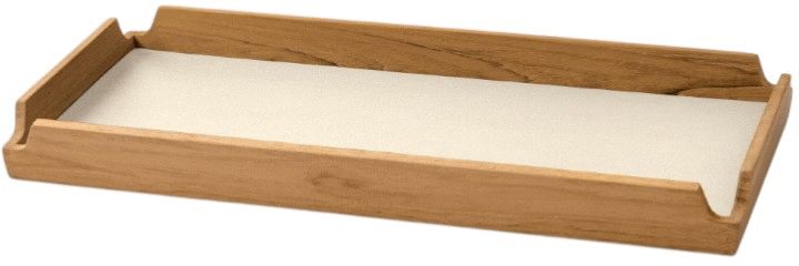 Læderindlægget i Nupo Vanilla kan nemt tages ud, hvilket gør bakken nem at rengøre og vedligeholde. Teaktræet er overfladebehandlet, så eventuelle spild ikke trænger igennem og efterlader uønskede mærker. Indlægget er fremstillet af 80% genbrugt læder og 20% naturgummi, hvilket giver en behagelig tekstur og god beskyttelse af både bakke og bordoverflade.