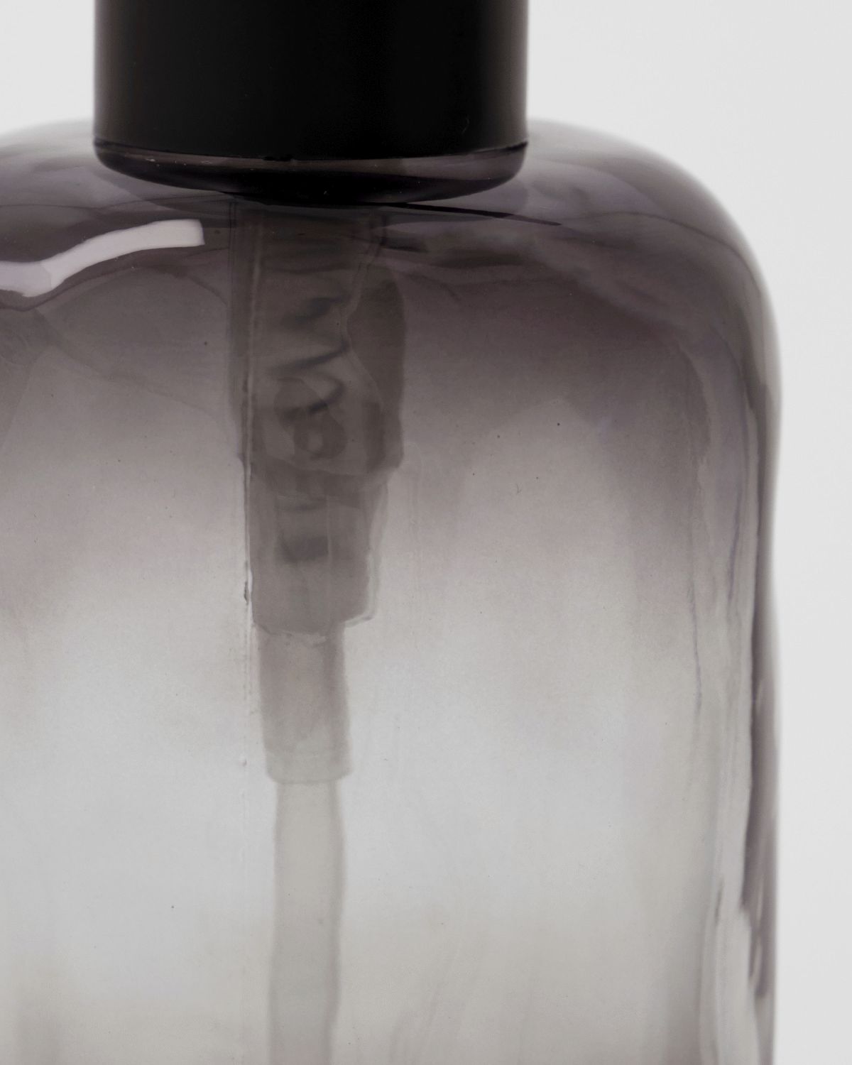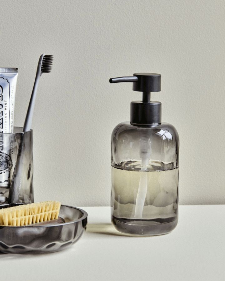 House Doctor Wah sæbedispenseren kombinerer funktionel elegance med et visuelt tiltalende design, der passer perfekt ind i ethvert moderne badeværelse eller køkken. Den karakteristiske røgfarvede glaskrop har en semi-transparent finish, der giver et raffineret og diskret udtryk, mens den samtidig skaber en blød kontrast til de omgivende flader. Den fine, krusede overfladetekstur tilføjer en skulpturel dimension, som gør dispenseren til mere end blot et praktisk tilbehør – den bliver et stilfuldt designelement i sig selv.Den sorte pumpe i metal udgør en perfekt kontrast til glassets dæmpede tone og understreger produktets stilrene profil. Kombinationen af materialer og farver skaber en balance mellem det industrielle og det elegante, hvilket gør Wah sæbedispenseren ideel til både minimalistiske og mere klassiske indretningsstile. Med sine kompakte mål på 17 cm i højden og en diameter på 7,4 cm finder den let sin plads ved vasken, uden at tage for meget plads.