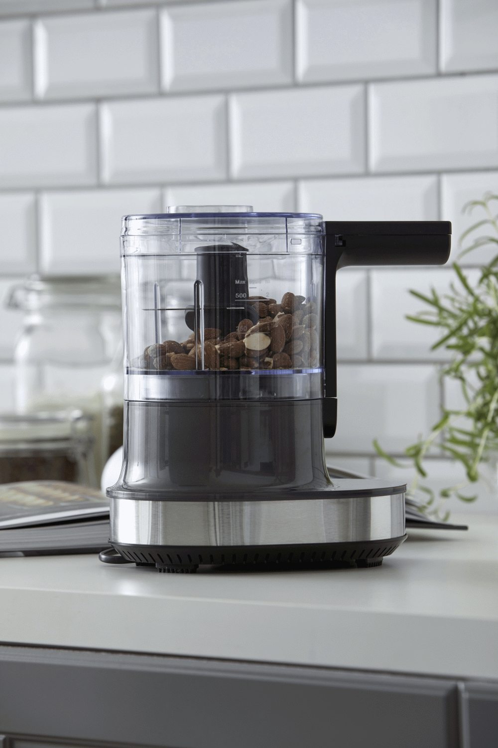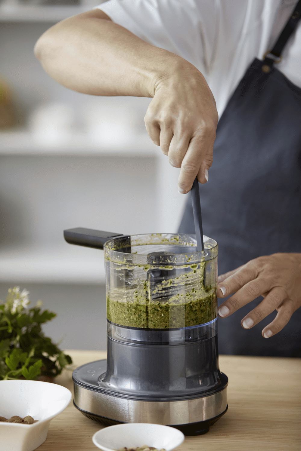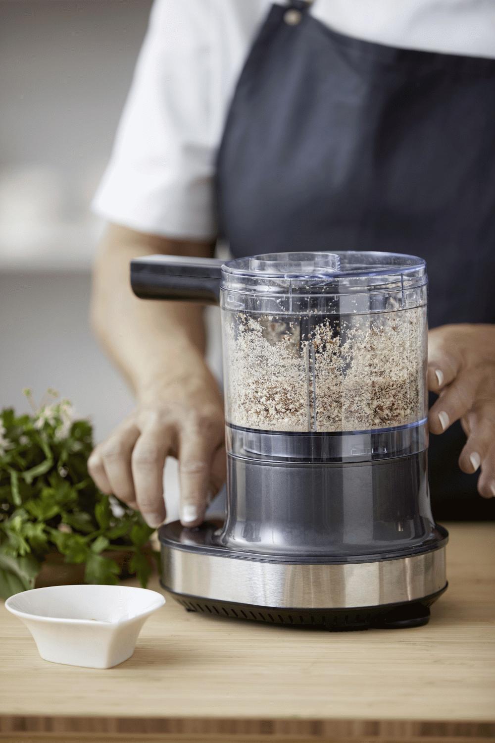 Multihakkeren er utrolig alsidig og håndterer både tørre ingredienser som nødder og krydderier samt våde tilberedninger som hummus, dips og vaffeldej. Den innovative kniv roterer og bevæger sig samtidig op og ned, hvilket sikrer en ensartet og grundig hakning hver gang.