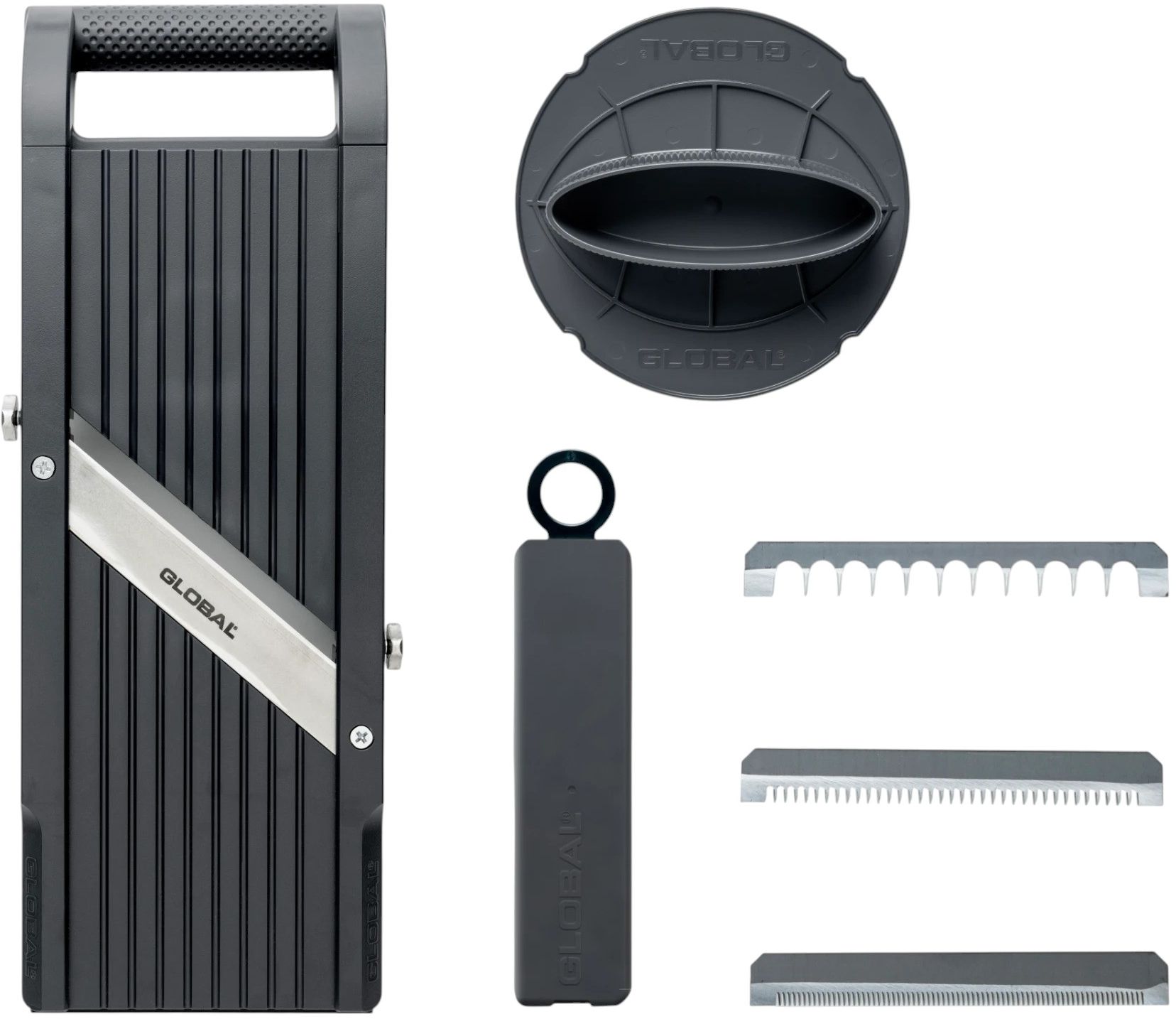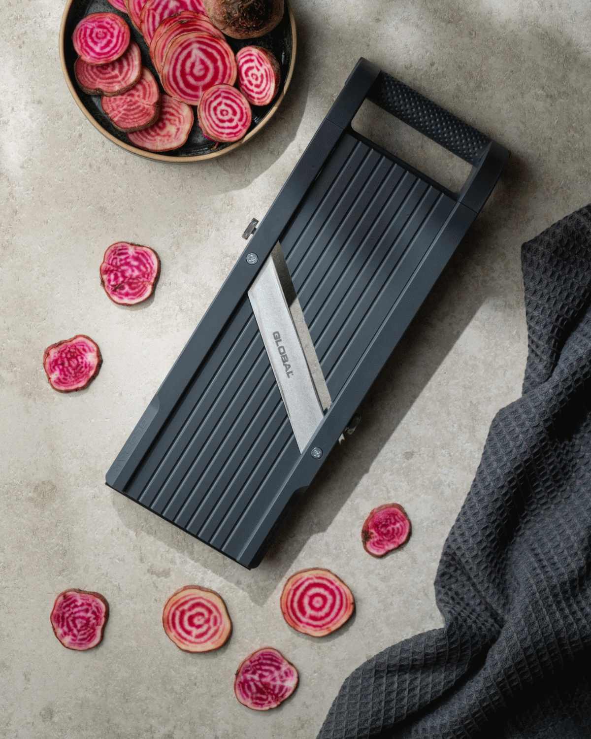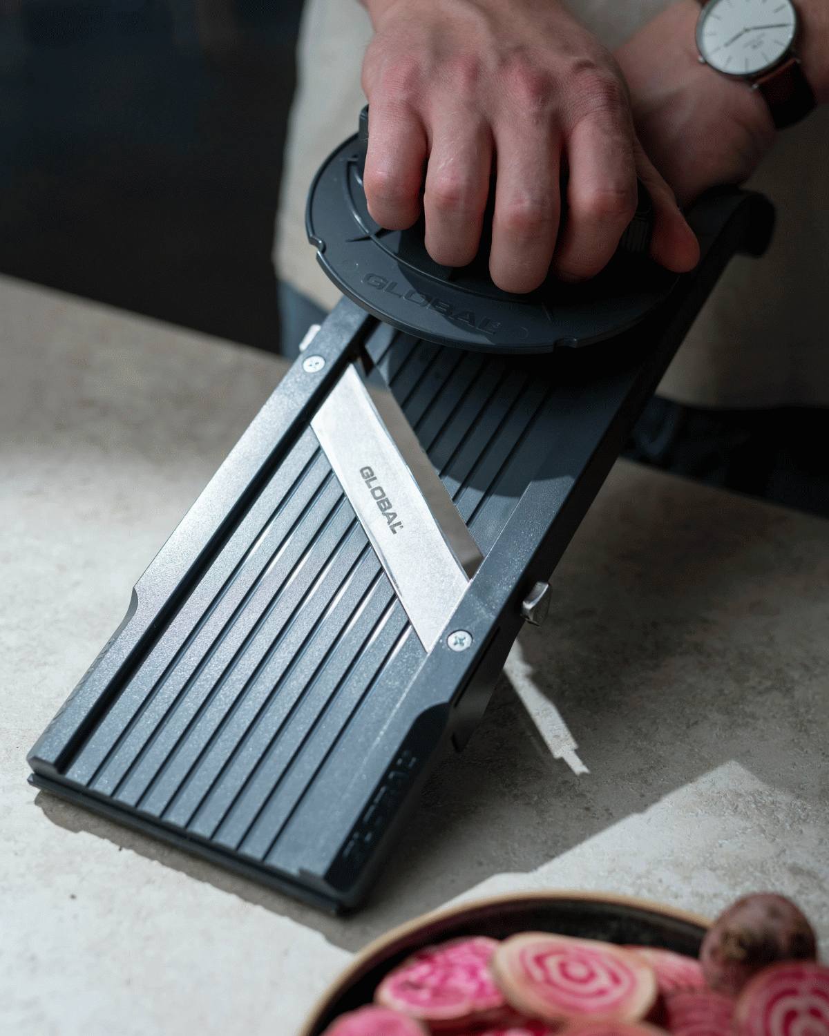 Den professionelle Global mandolin i grå leverer præcision og alsidighed til dit køkken med sin skarpe, håndslebne klinge og justerbare skivefunktion. Dette pålidelige køkkenredskab er designet til at give dig perfekte resultater hver gang, uanset om du skærer tynde agurke-skiver til salater eller tykkere kartoffelskiver til gratin.Med sin robuste konstruktion og gennemtænkte funktioner gør denne mandolin det nemt at opnå ensartede skiver af grøntsager og rodfrugter. Det faste, lige blad er håndslebet for optimal skarphed og kan endda slibes igen, når det bliver nødvendigt, hvilket sikrer lang levetid og vedvarende præstation.
