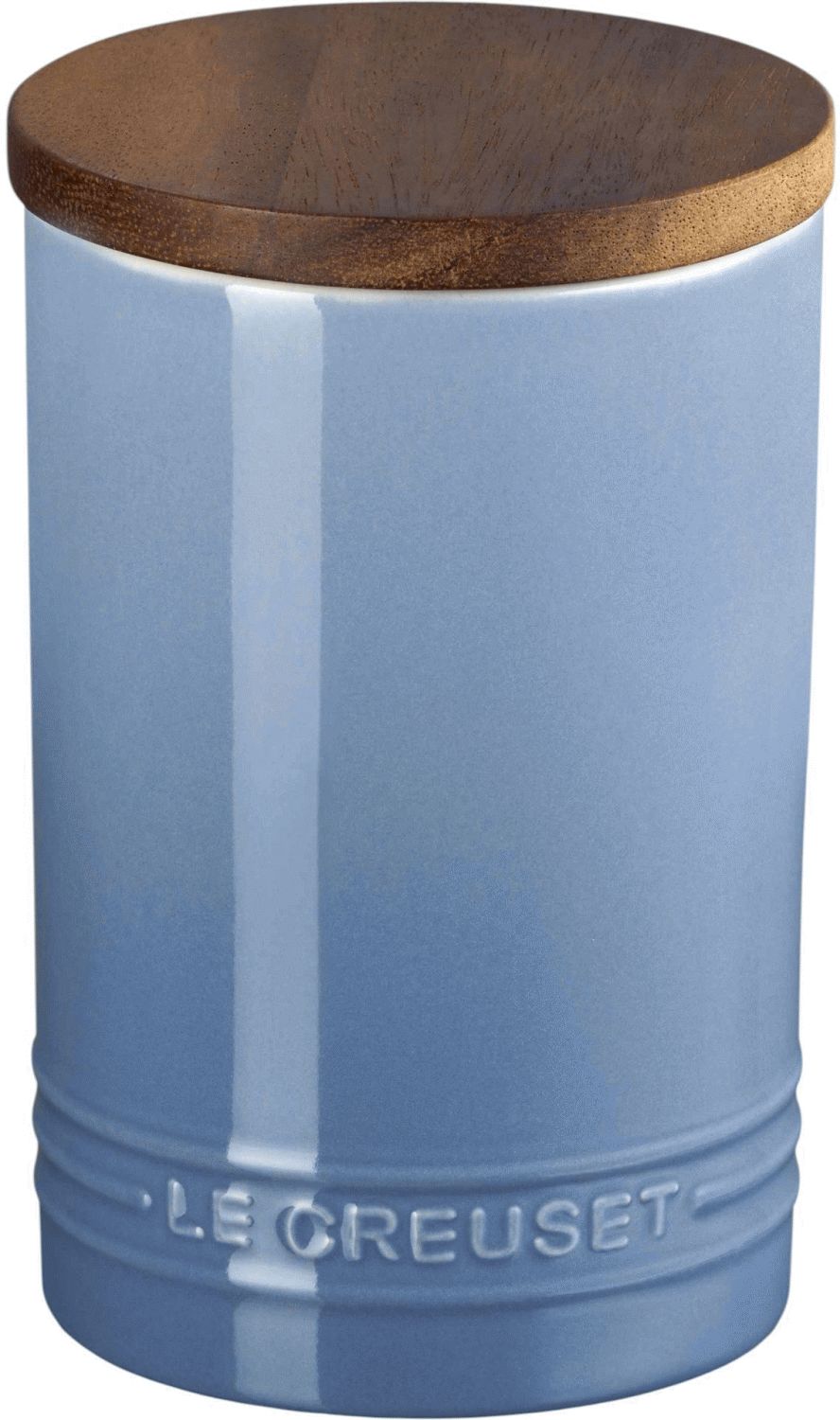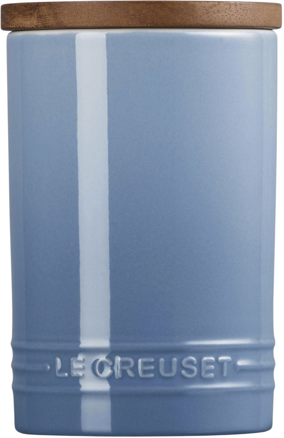 Le Creuset Signature Opbevaringskrukke i Chambray er designet til at holde dine ingredienser friske, mens den tilføjer et elegant farveaccent til køkkenet. Med sin karakteristiske form og høje kvalitet repræsenterer denne opbevaringskrukke det bedste fra Le Creusets håndværkstradition og funktionelle design.Krukken er fremstillet i Le Creusets eksklusive stentøj, der produceres af udvalgte lertyper og brændes ved ekstremt høje temperaturer. Denne proces sikrer en stærk og holdbar konstruktion, der kan modstå daglig brug. Den emaljerede overflade er nem at holde ren og modstår ridser, så krukken bevarer sit smukke udseende år efter år.