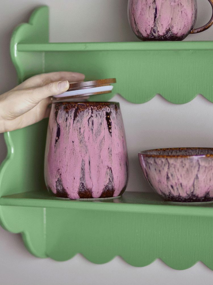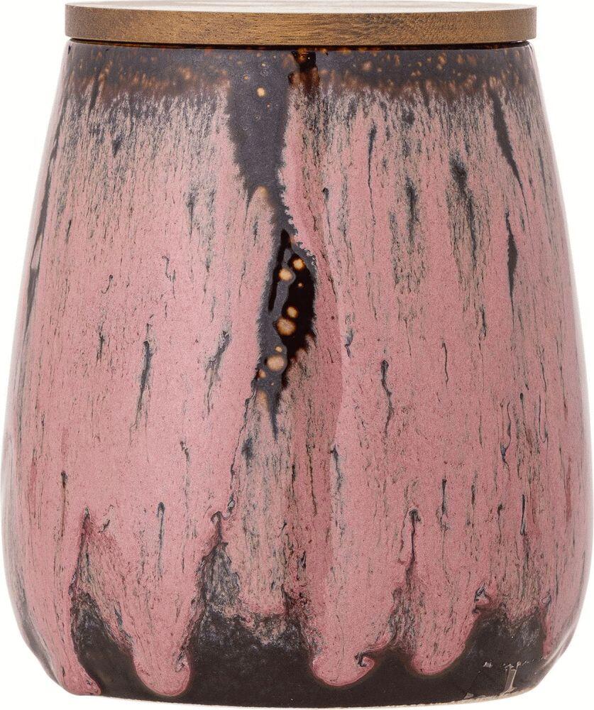 Rayen Krukken med låg fra Creative Collection er en opbevaringskrukke i stentøj med en reaktiv glasur, der skaber bløde prikker på en afdæmpet rosa overflade. Den glatte silhuet fuldendes af et fladt låg i træ. Produktet er fremstillet af naturlige materialer, så farvevariationer kan forekomme, hvilket gør hver krukke unik.Højde: 14,5 cm