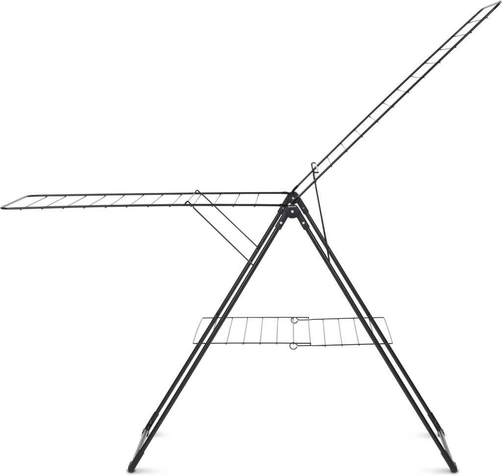 Rummelig - kan rumme op til to maskinfulde vasketøj. Til både stort og småt vasketøj - justerbar vingehøjde. Pladsbesparende - kompakt størrelse, når det er foldet sammen, og let at sætte op. Let at flytte, selv når det er fyldt med tøj - med transportlås. Ingen overraskelser - børnesikring forhindrer utilsigtet sammenklapning. Velegnet til (flad) tørring af sart vasketøj - med tørreplatform. Mindre risiko for skader på gulvet - med robuste beskyttelseskapper. Problemfri brug - 5 års garanti og service. Miljøvenlig - Cradle-to-Cradle®-certificeret, bronzeniveau. Det er også godt for miljøet - du sparer energi og støtter WeForest ved at plante flere træer. Klar til brug - pose til klemmer inkluderet.