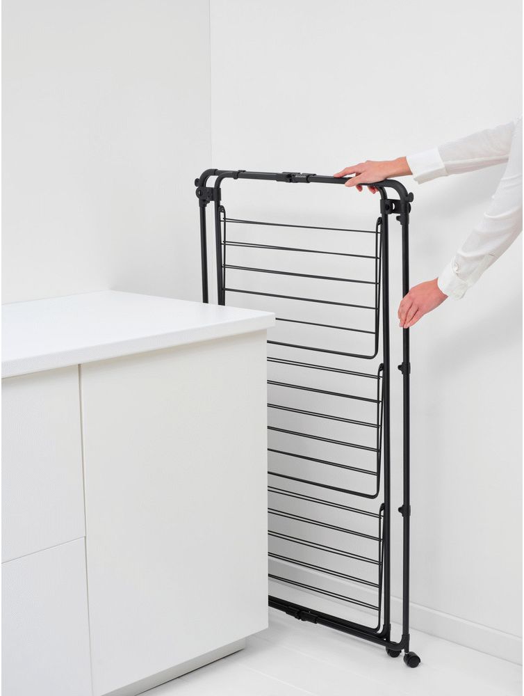 Spar energi ved at tørre dit vasketøj naturligt, og spar plads ved at hænge det på dette Brabantia HangOn Tårn tørrestativ! Med 23 meter fleksibel tørreplads plus ekstra kroge og holdere til bøjler, optager dette smarte tørrestativ minimal gulvplads - i sandhed en pladsbesparelse. Det har tre tørreniveauer, der hvert kan foldes efter behov, hvilket også gør det velegnet til lange genstande som håndklæder. De fire hjul gør det drejeligt og mobilt. Når alt er tørt, foldes stativet fladt sammen og opbevares kompakt. Transportlåsene holder rammen sammen og fungerer som kroge. Ved at købe dette stativ, støtter du også WeForest med at plante flere træer. Skal vi hænge ud? Pladseffektivt - stor tørrekapacitet, lille gulvplads.Kan rumme mere end to maskiner vasketøj - 23 meter tørreplads.Fleksibelt – fold de tre tørreniveauer ind eller ud, til små og store genstande.Let ophængning, hurtigttørrende - stor afstand mellem snorene.Nemt at flytte rundt på - fire robuste hjul.Kompakt tørring - rammen kan foldes halvt ud, så kun den ene side er i brug.Ekstra ophængningsplads - to hjørnekroge og clipsholdere til ekstra bøjlerKompakt opbevaring - transportlåsene holder rammen sammen, mens det er foldet, og fungerer som kroge, når det er foldet ud.Nemt at samle - trin for trin manual er inkluderet.Brugervenligt - 5 års garanti og service.Bevidst valg - vælg at tørre naturligt, og støt samtidigt WeForest med at plante flere træer.Genanvendelighed - fremstillet af 38 % genbrugsmaterialer og 96 % genanvendeligt efter brug.Bæredygtighed - Cradle to Cradle-certificeret, sølvniveau.Længde: 23 m cm