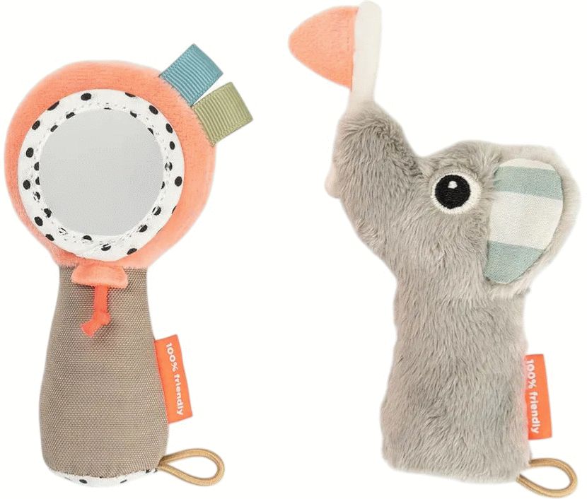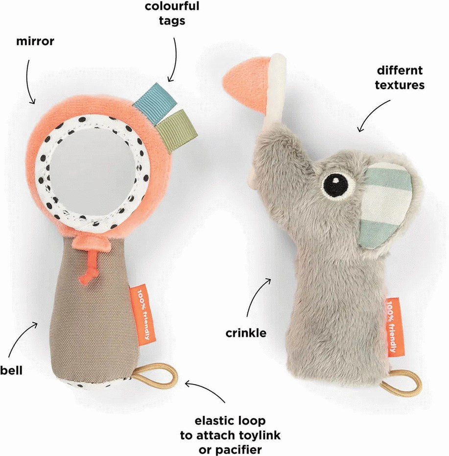 Done by Deer Celebration Sanserangle med Spejl inviterer de mindste til en verden af opdagelser gennem leg og udforskning. Denne ranglelegetøj er designet til at stimulere barnets sanser og understøtte den tidlige motoriske udvikling på en legende og engagerende måde.Ranglen kombinerer forskellige elementer, der hver især bidrager til barnets sensoriske oplevelse. Det integrerede spejl fanger barnets opmærksomhed og inviterer til selverkendelse, mens de farverige detaljer og varierede overflader giver visuel og taktil stimulation. De bløde krusninger og ranglende lyde skaber en auditiv dimension, der holder barnet engageret og nysgerrigt.