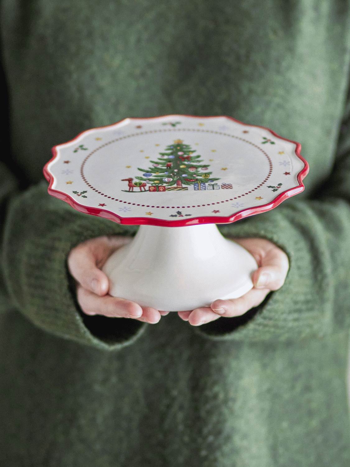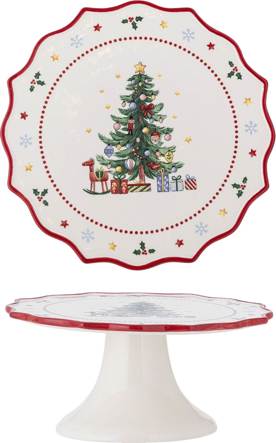 Det bølgede design tilføjer en elegant dimension til kagefadet og skaber interessante skygger og dybde, der fremhæver det håndmalede motiv. Den røde farve symboliserer julens varme og glæde, mens de detaljerede figurer bidrager til en nostalgisk julestemning, der appellerer til både børn og voksne.