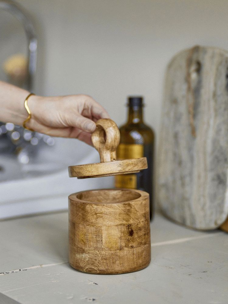 - Rund køkkenkrukke i mangotræ med glat, lakeret overflade