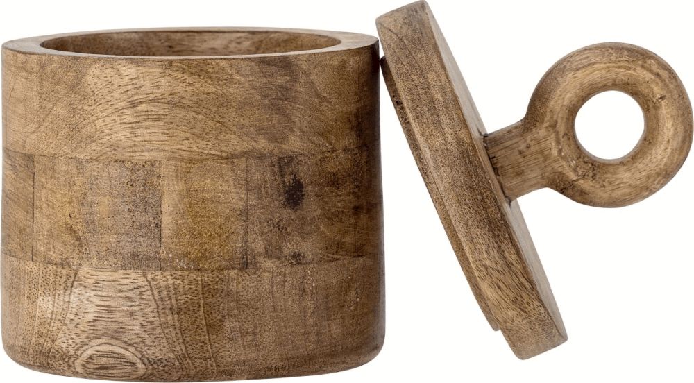 Krukken er designet med et let buet låg, der afsluttes med et rundt greb i en kontrasterende tone. Dette detalje skaber et visuelt interessant element og gør det nemt at åbne og lukke krukken. Den synlige åretegning i mangotræet giver hver krukke dybde og et levende spil i overfladen, så ingen to krukker er helt ens. Dette understreger produktets håndværksmæssige kvalitet og naturlige oprindelse.