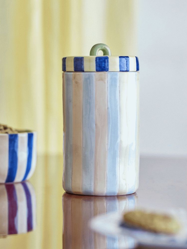 Bloomingville Phoenix Krukke med Låg – En Håndmalet Perle til Dit HjemPhoenix krukken med låg fra Bloomingville er en smuk og funktionel opbevaringsløsning, der kombinerer skandinavisk designtradition med et levende, farverigt udtryk. Med sin karakteristiske stribede overflade og kontrastfarvet låg bringer denne krukke personlighed og varme ind i ethvert rum.