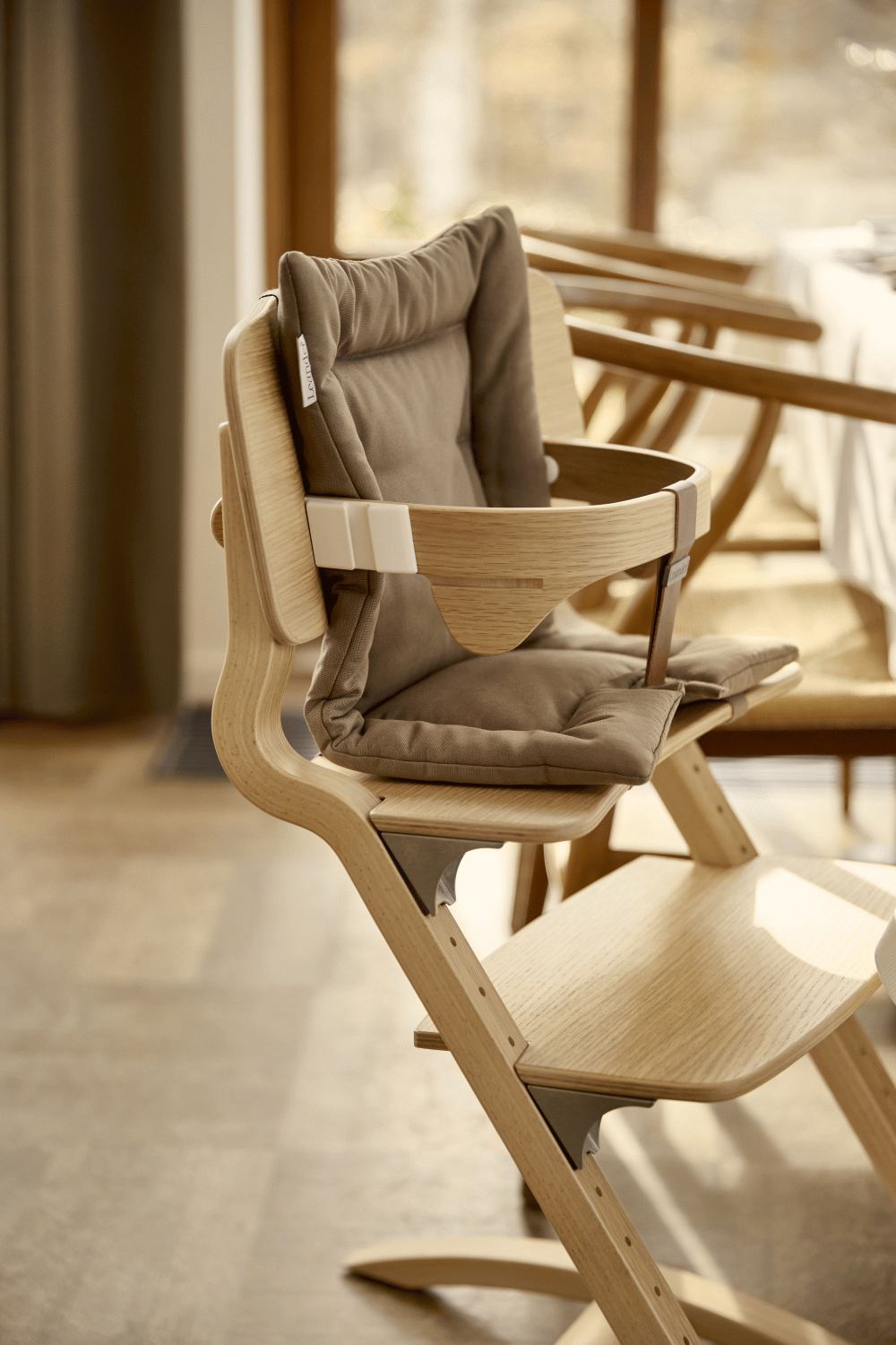 Den specialdesignede form sikrer, at hynden sidder fast på stolen og ikke flytter sig under brug. Dette giver en ensartet siddekomfort gennem hele måltiderne og bidrager til en mere afslappet spiseoplevelse for hele familien. Hyndens ekstra støtte til ryggen er især vigtig for mindre børn, der stadig udvikler deres balance og kropsholdning.