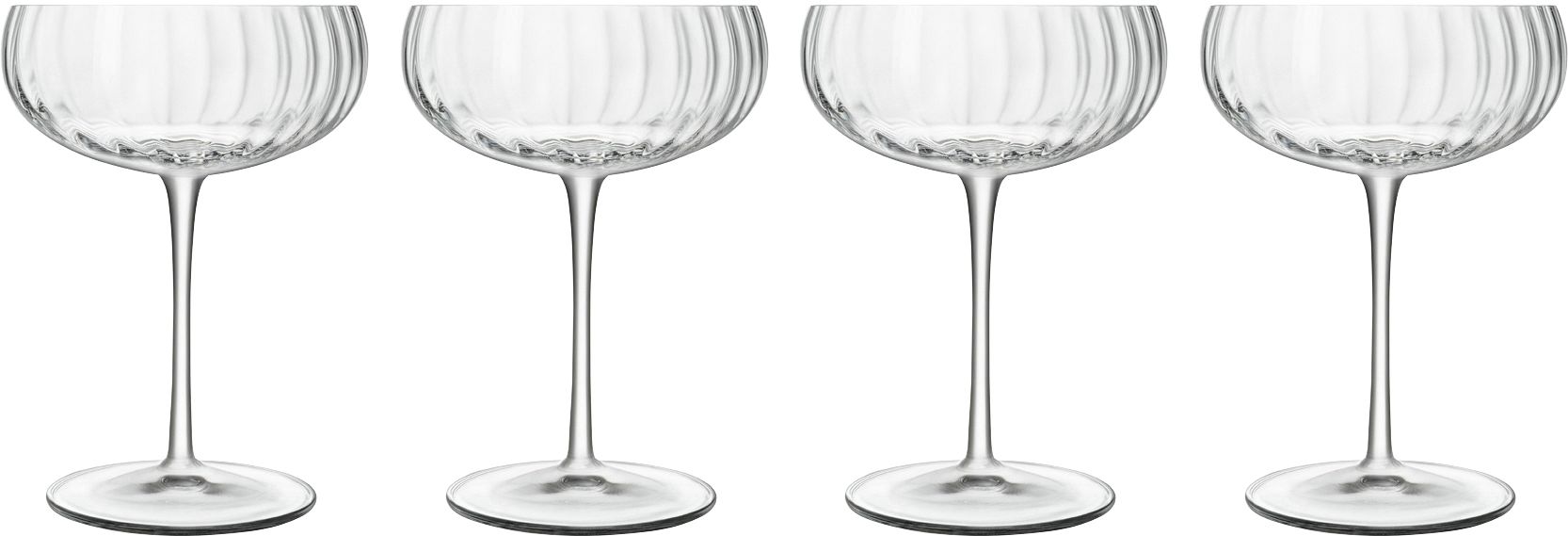 Luigi Bormioli Optica Champagneskål 4 stk. 30 clElegance møder funktionalitet i disse eksklusive champagneskåle fra Luigi Bormioli's populære Optica-serie. Det smukke plisserede design skaber et fascinerende lysspil, der fremhæver enhver festlig anledning og giver din borddækning et sofistikeret udtryk. Fremstillet i det innovative SON.hyx® Superior Sonoro-glas, repræsenterer disse skåle den perfekte kombination af italiensk designtradition og banebrydende glasteknologi.