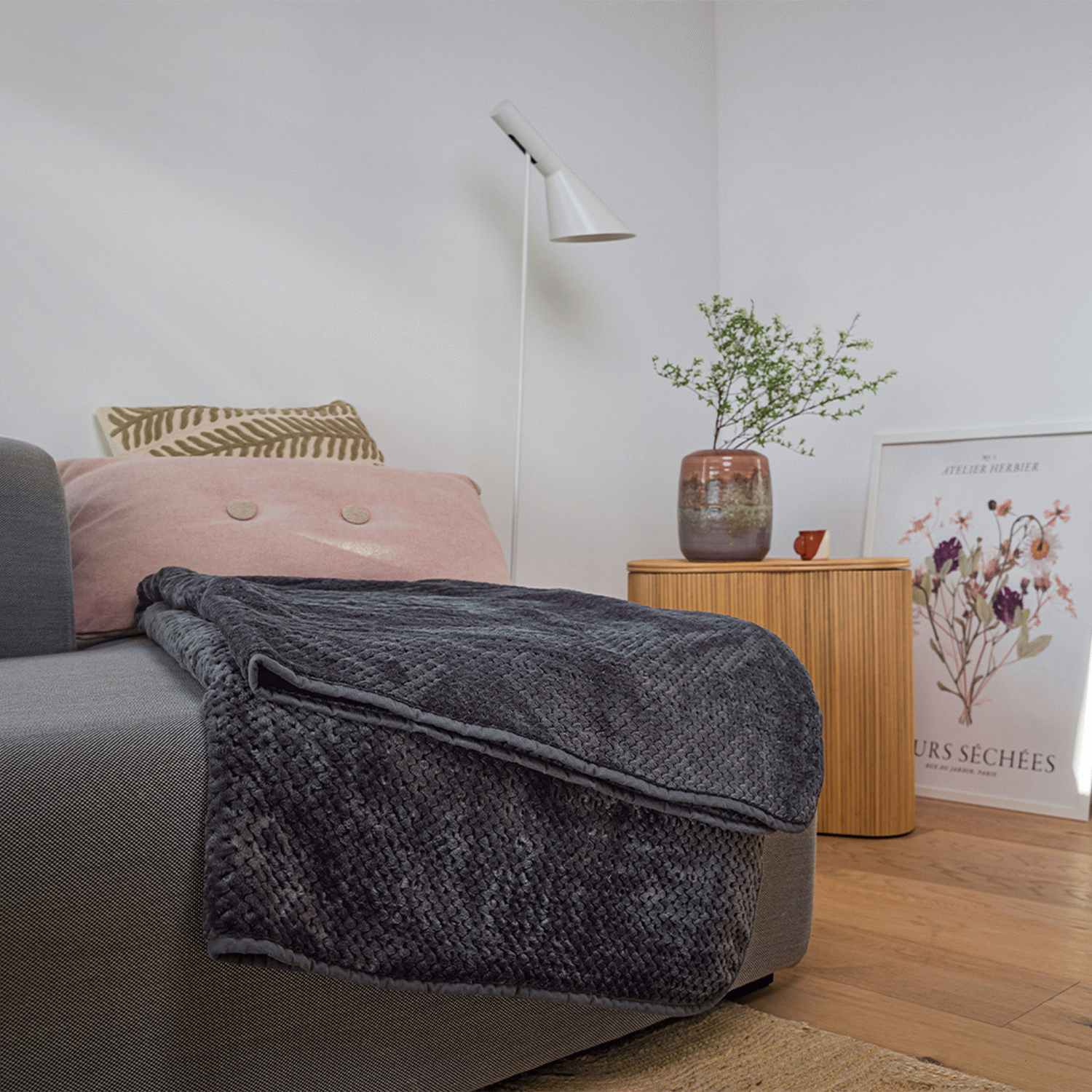 Det bløde microfleece-materiale føles behageligt mod huden og skaber en luksus følelse af varme og tryghed. Den mørkegrå farve integreres naturligt i enhver indretningsstil og fungerer som et stilfuldt tilbehør, der både varmer og pynt dit hjem. Materialets åndbare egenskaber sikrer optimal komfort uden overvarmning.