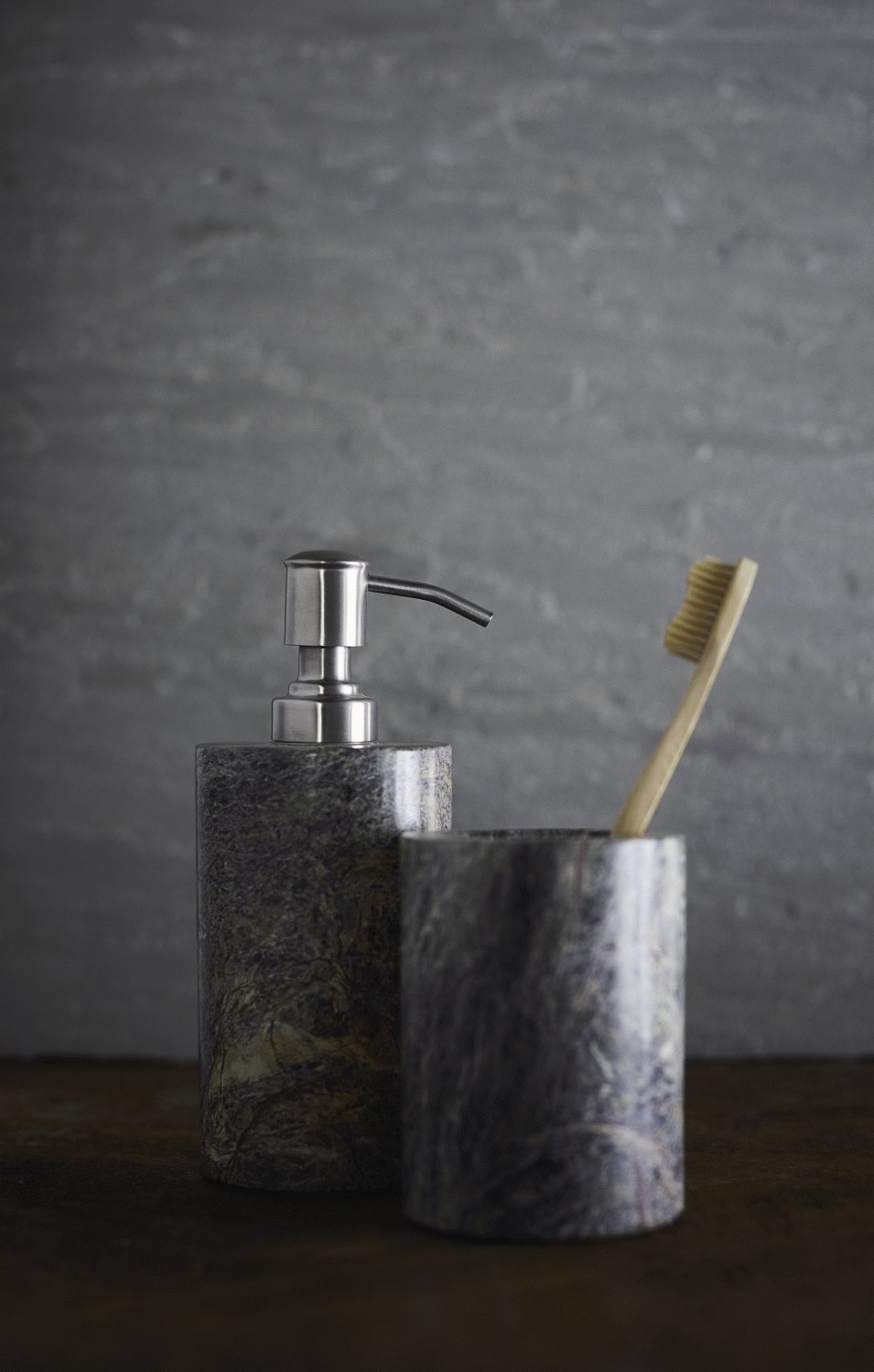 Det stilfulde tandbørstekrus er skabt af eksklusivt grønt marmor, der tilføjer en robust og elegant dimension til enhver indretning. Marmorets naturlige karakteristika sikrer, at dit Vita tandbørstekrus bliver et enestående kunstværk, der skaber smukke kontraster til andre materialer i rummet. Den grønne nuance fremhæver marmorets naturlige skønhed og giver en sofistikeret følelse til badeværelset.
