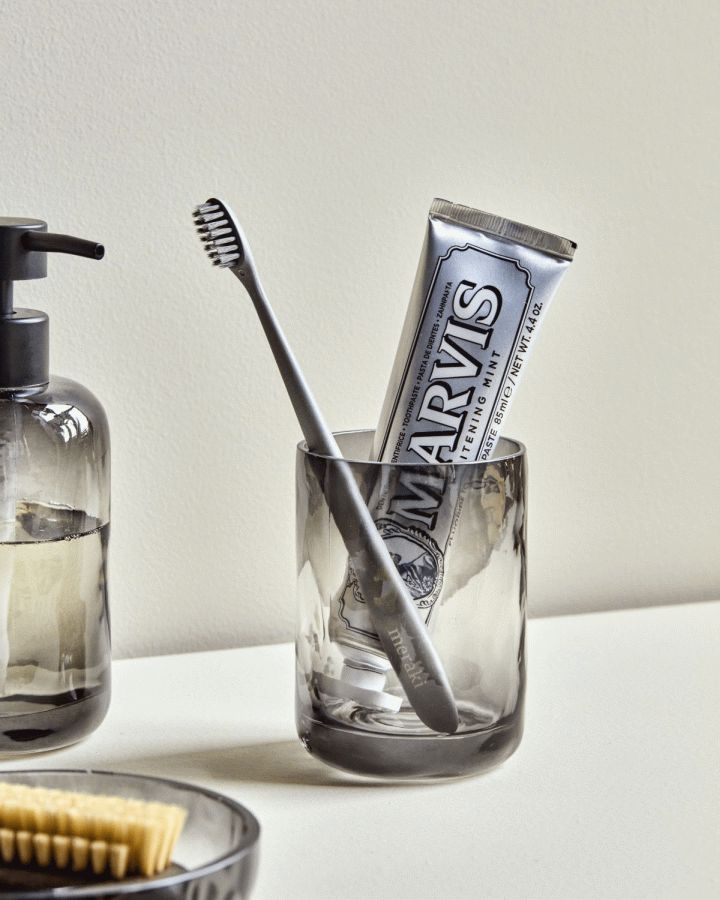 Den organiske form og det røgfarvede glas skaber en harmonisk balance mellem funktionalitet og æstetik. Tandbørsteholderen kan rumme tandbørster og tandpasta diskret og stilfuldt, samtidig med at den fungerer som et dekorativt element på badeværelsets hylde eller ved vasken. Den neutrale gråtone gør det nemt at kombinere holderen med andre badeværelsestilbehør og farver.