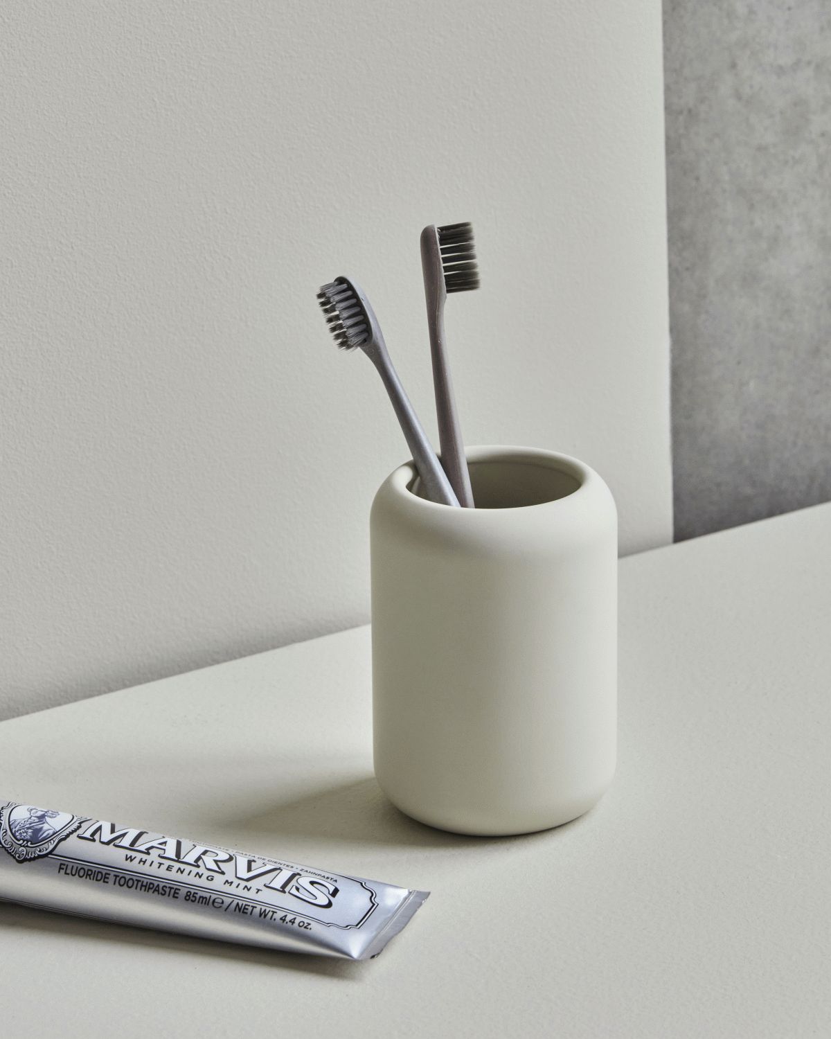 Stentøjets naturlige karakter giver hver tandbørsteholder et unikt udtryk, hvor den råhvide nuance bidrager til en rolig og harmonisk atmosfære. Den afrundede form ligger behageligt i hånden og gør det nemt at flytte tandbørsteholderen, når badeværelset skal gøres rent. Det taktile materiale med den matte overflade føles behageligt at røre ved og skaber en varm fornemmelse i rummet.