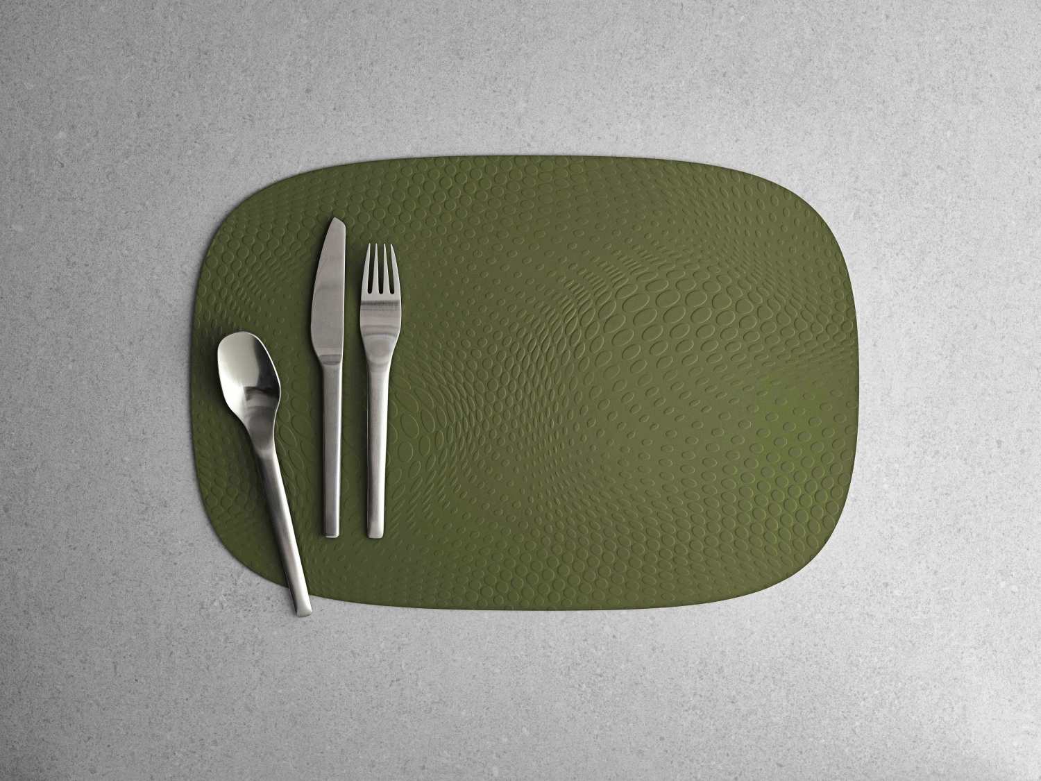 Det organiske mønster, som kendetegner Karim Rashids designfilosofi, giver dækkeservietten et levende og kunstnerisk udtryk. De flydende former og den kraftige grønne farve skaber en spændende kontrast til både neutrale og farverige servicer. Materialet er nemt at vedligeholde – en hurtig aftørring er ofte alt, hvad der skal til for at holde den i perfekt stand.