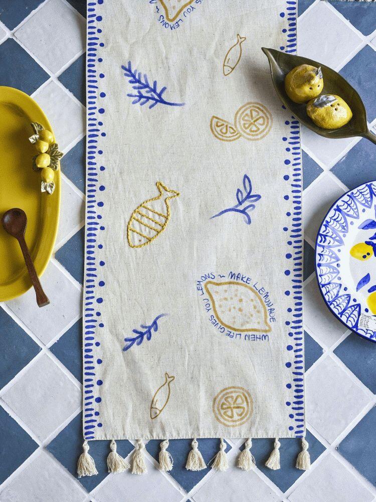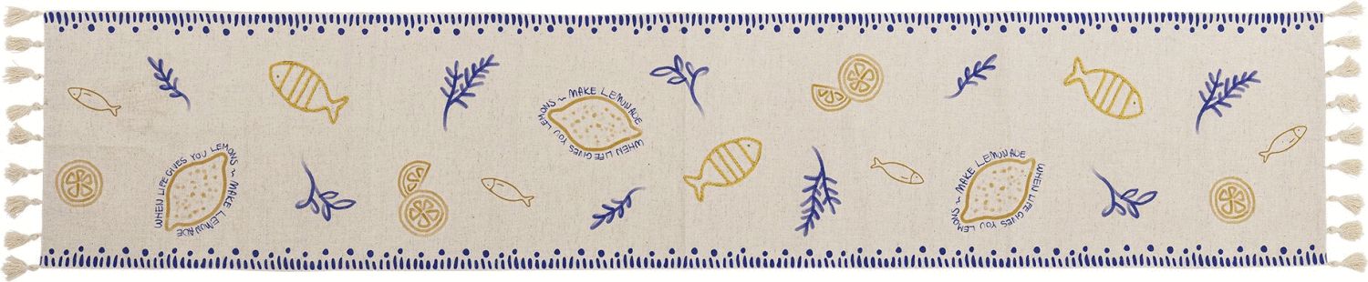 Maxima Bordløberen fra Creative Collection er vævet i bomuld med en trykt forside med motiver af fisk, citrus og urter, mens bagsiden er ensfarvet. Designet er i blå på en beige bund og fuldendes af mørke syninger og lyse kvaster. Vævet kvalitet med printet mønster og ensfarvet bagside.Længde: 180 cm
