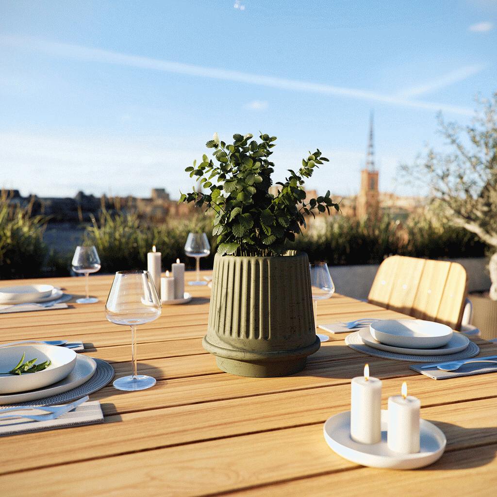 Gaia 16 urtepotteskjuler fra SACKit kombinerer klassisk inspiration med moderne funktionalitet i et design, der passer perfekt til både terrassen og haven. Med sin karakteristiske riflede overflade og tidløse form skaber denne krukke et elegant udtryk, der fremhæver dine planter på smukkeste vis.Designet er inspireret af den antikke græske æstetik, og navnet Gaia henviser til den græske gudinde for Jorden og jordens frugtbarhed. Den matte olivengrønne finish giver krukken et naturligt og harmonisk udtryk, der falder smukt ind i ethvert udemiljø. Den riflede overflade skaber et flot lysspil, når sollyset rammer krukken, hvilket tilføjer dybde og dimension til designet.