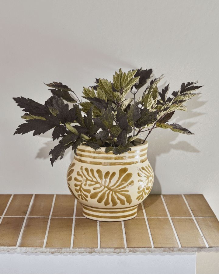 Krukken er fremstillet i lertøj, et materiale kendt for sin holdbarhed og autentiske karakter. Den varme, beige nuance giver potten et jordnært udtryk, der let kan kombineres med forskellige farveskemaer og indretningsstile. Det diskrete mønster på overfladen tilføjer en subtil tekstur, der fanger lyset på en smuk måde uden at dominere det samlede udtryk.