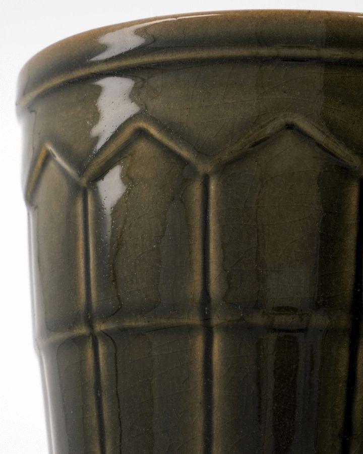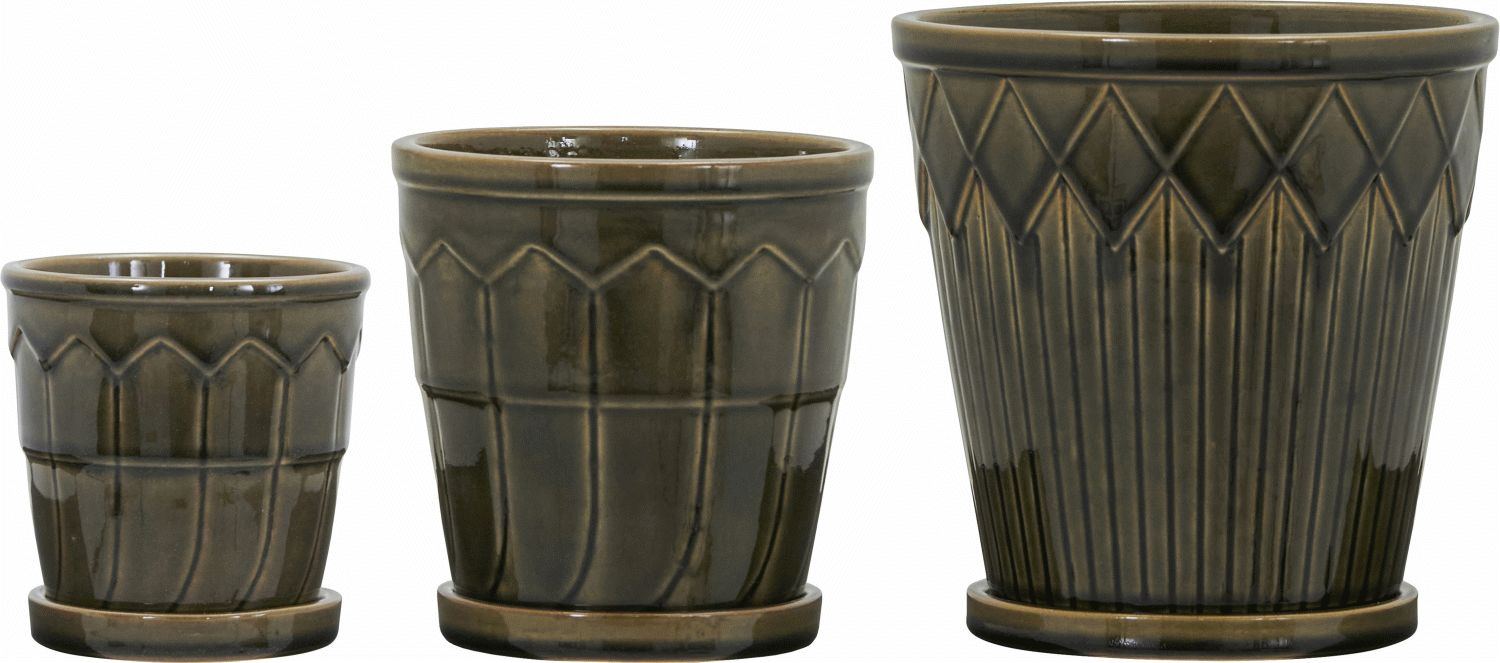 Lertøjet er behandlet med en elegant grå glasur, der fremhæver det geometriske mønster og giver potterne et eksklusivt look. Teksturen i overfladen skaber et spændende samspil mellem lys og skygge, hvilket tilføjer dybde og karakter til designet. De tre forskellige størrelser gør det let at sammensætte potterne i grupper eller placere dem individuelt rundt omkring i hjemmet eller haven.