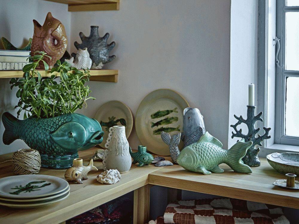 Med sine generøse mål på 43,5 cm i længden og 20 cm i højden rummer Hiro både mindre og mellemstore urtepotter. Dens skulpturelle form gør den til et dekorativt element i sig selv, som kan bruges til at fremhæve dine yndlingsplanter eller skabe et visuelt fokuspunkt på vindueskarmen, reolen eller bordet. Den detaljerede udformning med fiskens karakteristiske træk gør urtepotteskjuleren til mere end blot et praktisk opbevaringsredskab – den bliver et samtaleemne og et kunstværk i hjemmet.