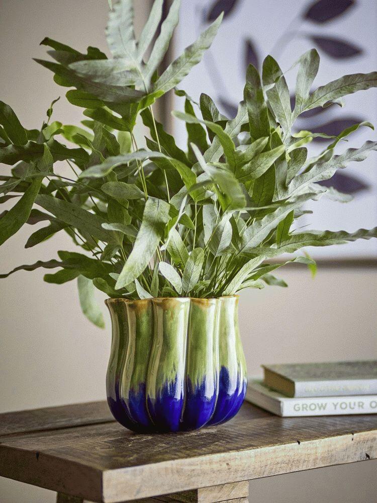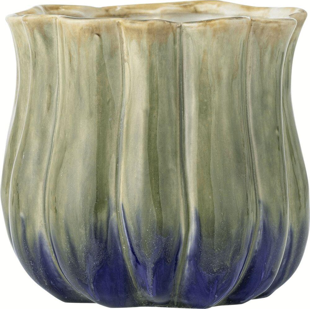 Den blødt bølgede form med lodrette riller giver urtepotteskjuleren en struktureret overflade, der fanger lyset på en smuk måde og skaber dybde i designet. Med en højde på 15 cm og en diameter på 16,5 cm passer den perfekt til standardurtepotter og giver plads til både mindre krydderurter og større stueplanter. Farvepaletten med grønne, blå og beige toner gør den let at integrere i forskellige indretningsstile, fra skandinavisk minimalisme til mere farverige og eklektiske udtryk.