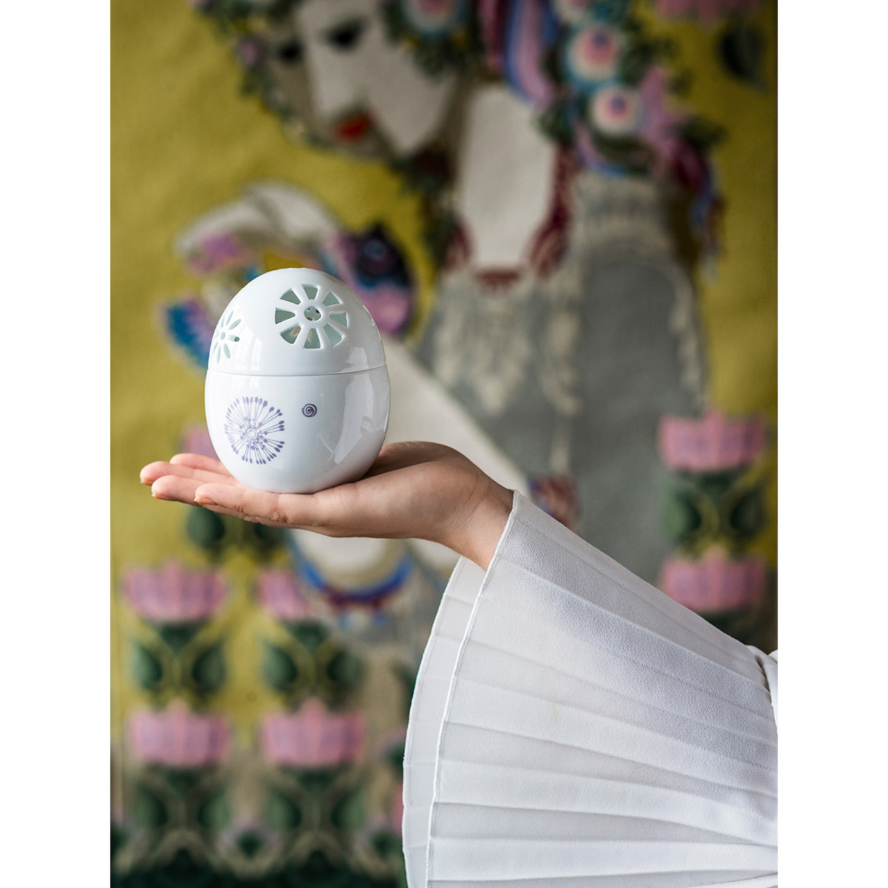 Bjørn Wiinblads lille, hvide bonbonniere i hvidt porcelæn er dekoreret med smukke, syrenlilla blomsterdekorationer og huldekorationer i toppen. Den måler 11,2 cm i højden, og du kan eksempelvis bruge den til opbevaring, som påskeæg, eller du kan sætte en lille, fin blomst i den og bruge den som vase. Den er flot at have stående til pynt igennem hele foråret og påsken, hvor den kan supplere de kønne blomsterhoveder fra Bjørn Wiinblad.Serie:Easter