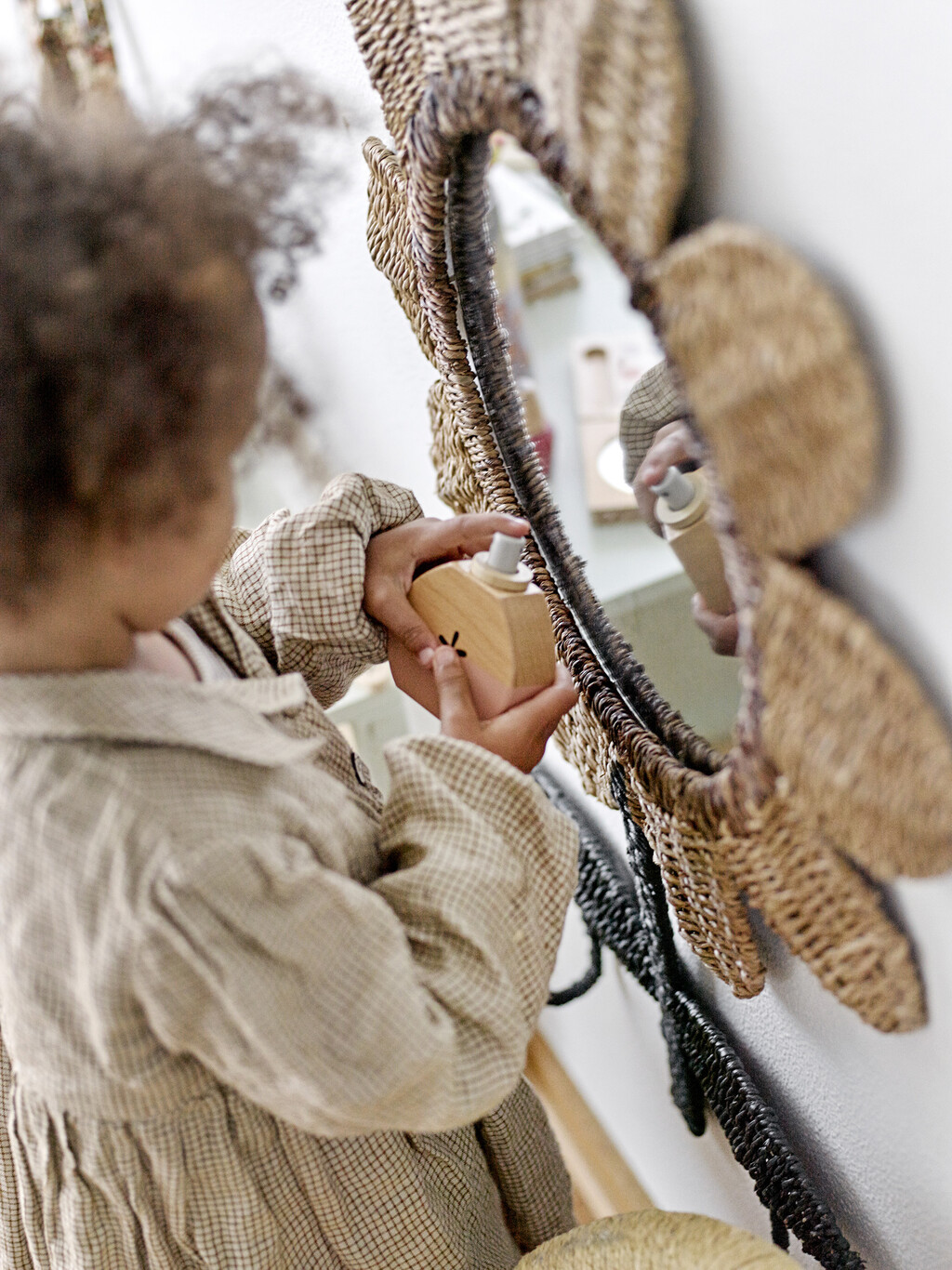 Nabiya spejlet fra Bloomingville MINI er lavet i bankun græs og har et flot naturligt look. Spejlet er formet som en blomst med to kroge til dit yndlingstørklæde eller MINI taske.