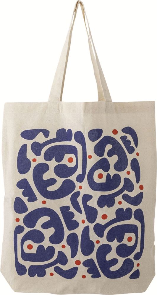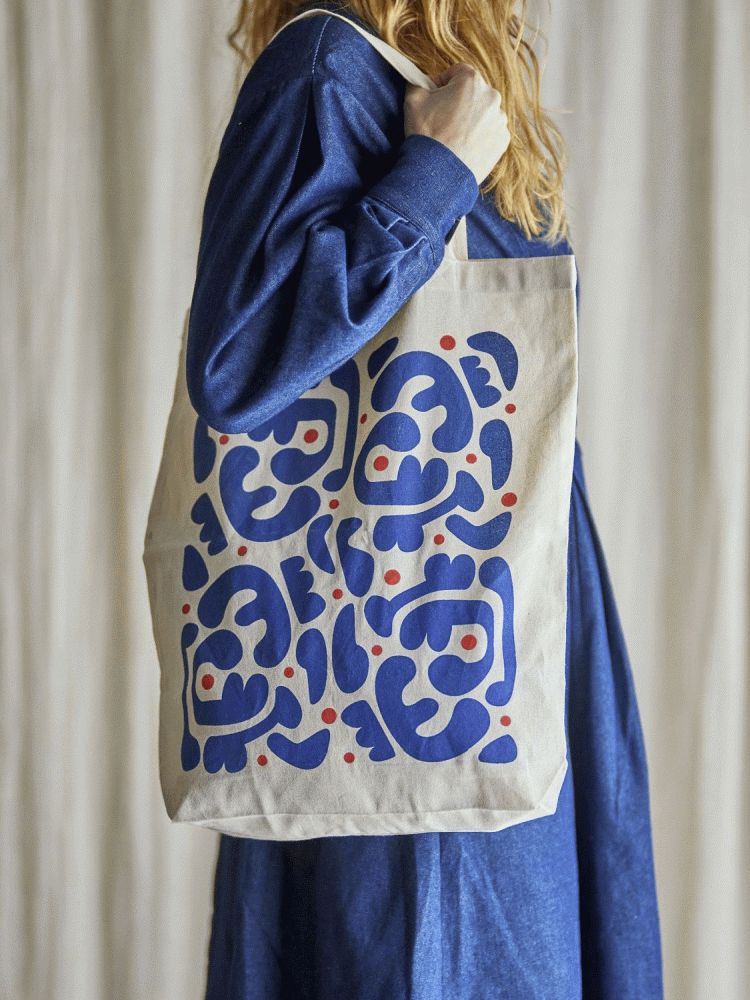 Designet udmærker sig ved sin blød beige nuance, der danner en harmonisk base for de abstrakte blå former og røde detaljer. Dette farvesammenspil skaber et moderne og levende udtryk, som passer perfekt til både afslappede og mere formelle sammenhænge. Posen er designet med lange hanke, hvilket gør den behagelig at bære over skulderen, uanset om du er på vej til indkøb, arbejde eller en dag i byen.