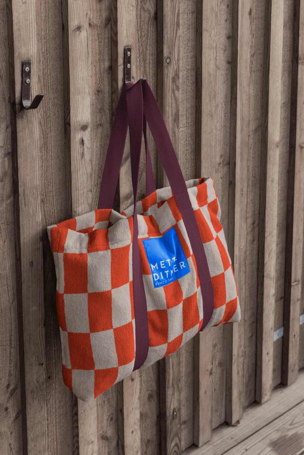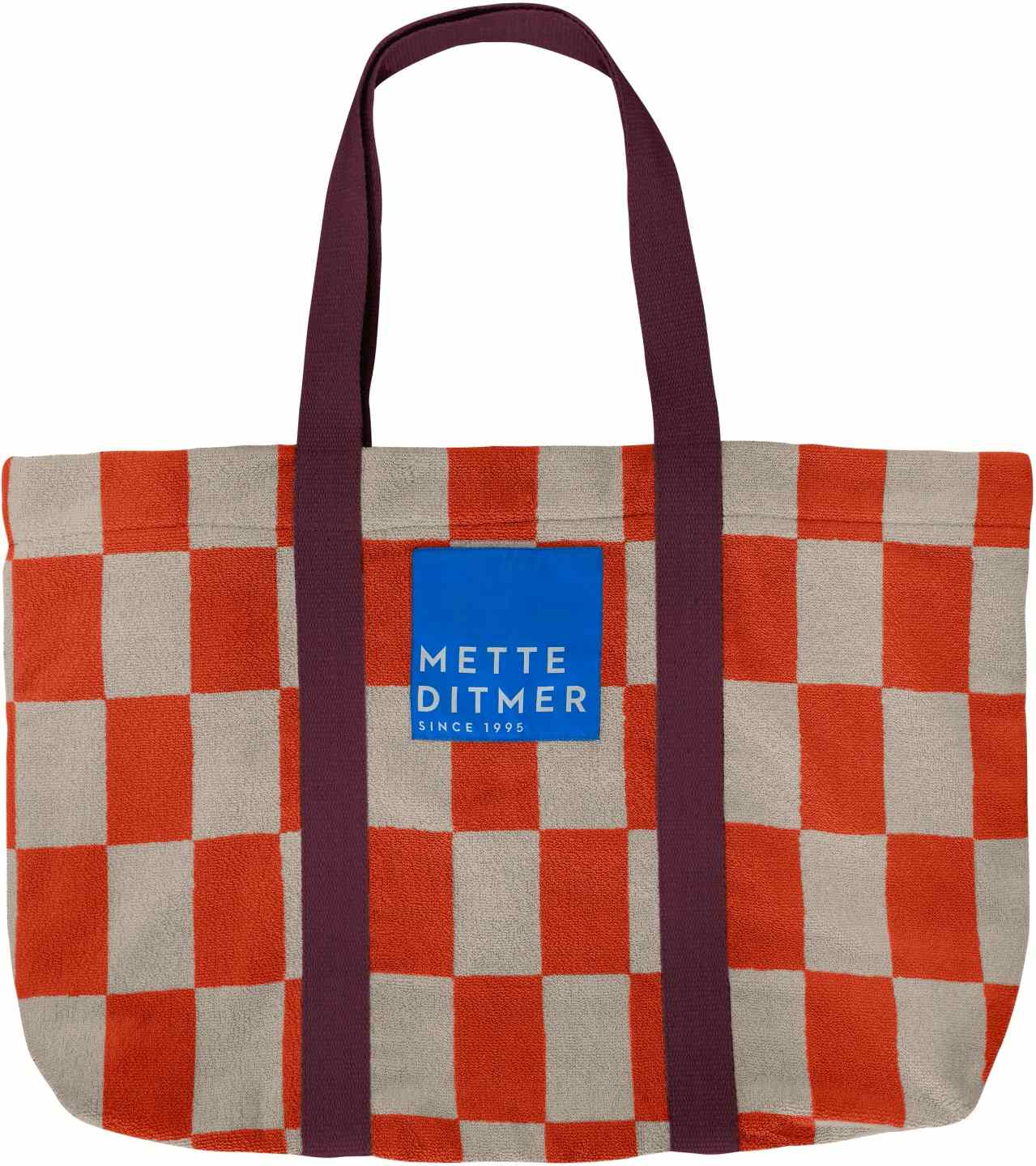 RETRO-tasken oversætter det orange og sandfarvede mønster til en rummelig shopper med et tydeligt grafisk udtryk. De vinrøde canvasstropper står smukt mod den bløde frottéoverflade, og den store, koboltblå logo-label på forsiden tilføjer en klar kontrast. Indvendigt har tasken en lille lomme med vinrød lynlås – ideel til nøgler og småting. Velegnet til hverdag, rejser eller en dag på stranden. OEKO-TEX® standard 100-certificeret.Vaskes ved 30° C vask med vrangen, undgå skyllemiddel, ikke velegnet til tørretumbling.Bredde: 64 cm