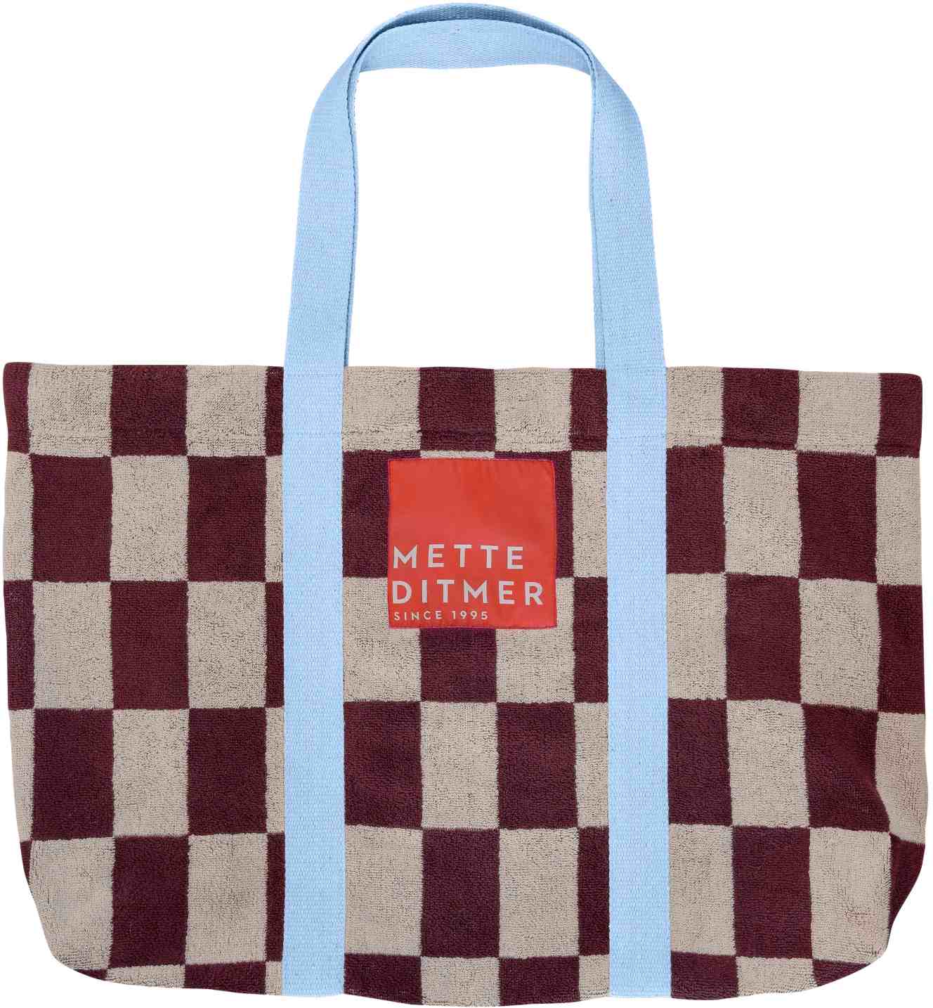 RETRO-tasken har det markante geometriske mønster i sand og vinrød. Den er fremstillet i blød frotté med lange, solide canvasstropper i kontrastfarvet lyseblå, som giver et legende og moderne udtryk. En stor, vævet logo-label i orange på forsiden tilfører en grafisk signatur, mens en lille inderlomme med kontrastfarvet lynlås holder styr på de små ting. Perfekt til stranden, shopping eller weekendture. OEKO-TEX® standard 100-certificeret.Vaskes ved 30° C vask med vrangen, undgå skyllemiddel, ikke velegnet til tørretumbling.Bredde: 64 cm
