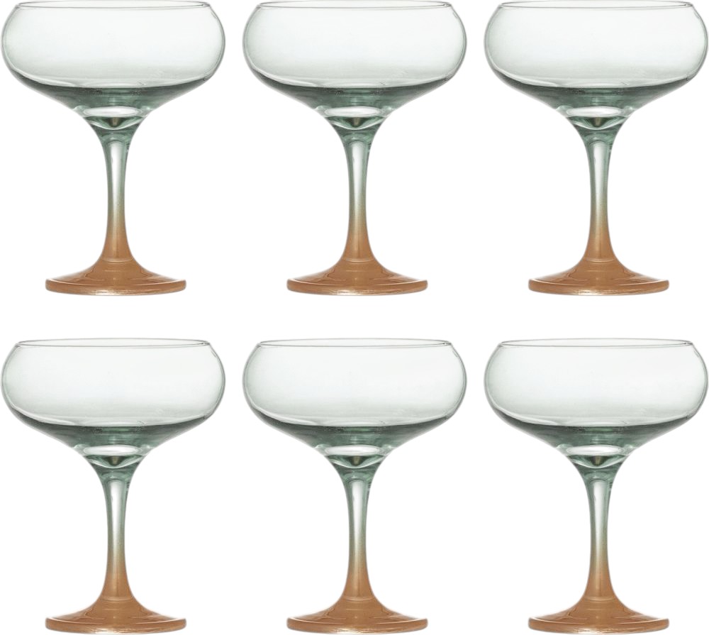 Signe Cocktailglasset fra Bloomingville bringer farveglæde og personlighed til enhver anledning. Dette sæt består af seks elegante cocktailglas, hvor hvert glas er forarbejdet med en spraymalet finish, der skaber et unikt og kunstnerisk udtryk. Glassene kombinerer en blød grøn tone i skålen med varme orange stilke, og de diskrete nuancer af rav og turkis tilføjer dybde og karakter til designet.Med en højde på 13 cm og en diameter på 9,5 cm er disse glas perfekte til at servere cocktails, drinks eller andre lækre drikkevarer. Det farvede design gør dem til et smukt element på bordet, uanset om du arrangerer en festlig sammenkomst eller bare nyder en afslappet aften derhjemme. Glassenes transparente kvalitet sikrer, at drikkens farver skinner igennem, mens de spraymålede detaljer tilføjer en ekstra dimension af stil.