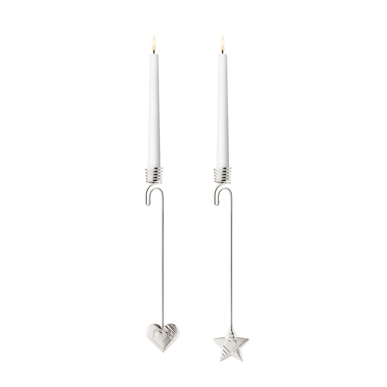 Intet er mere juleagtigt, end når lysene tændes på træet! Gør julen endnu smukkere med disse fine lyseholdere, der er udsmykket med henholdsvis en sølvfarvet stjerne eller et hjerte forneden. Stjernen og hjertet er udsmykket med grafiske art deco-design, der reflekterer lyset på smukkeste vis.
