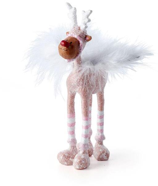 Rudolf har klædt sig i lyserødt og en sky af hvide, florlette fjer for at gøre hverdagen lidt festligere. Det er lige til at blive glad i låget af. Den sjove figur er lavet af polyresin og er 11 cm høj. Figuren er håndmalet. Design: Medusa-Copenhagen.Rudolf m/fjer 11cm Lyserød